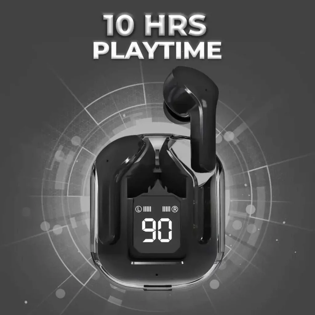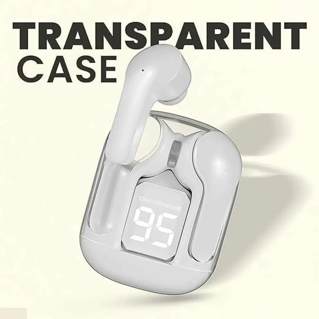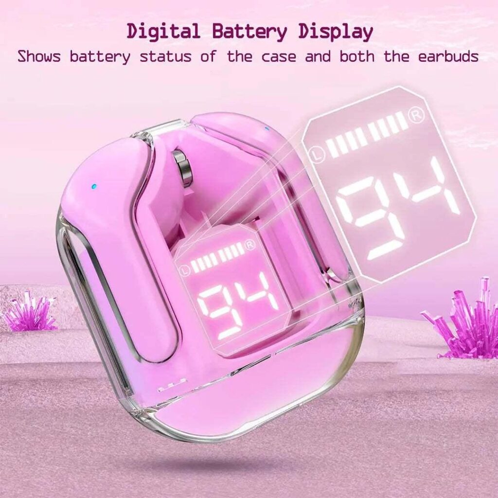 Featuring a stylish transparent case, the design adds a modern, futuristic touch while allowing you to see the inner workings of the earbuds. The built-in display provides essential information, such as battery life and pairing status, so you can stay informed at a glance.