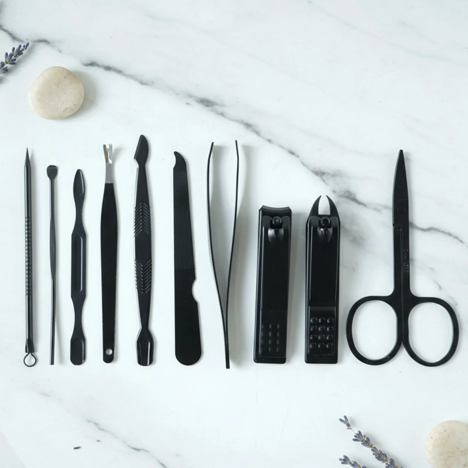 Includes nail cutters, scissors, tweezers, nail file, cuticle and cleaning tools