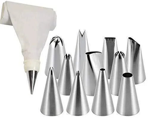 Cake Icing Decoration Tool Set(12pc), 11 Different Nozzles, 1 Icing Piping Coupler Bag (Silver)