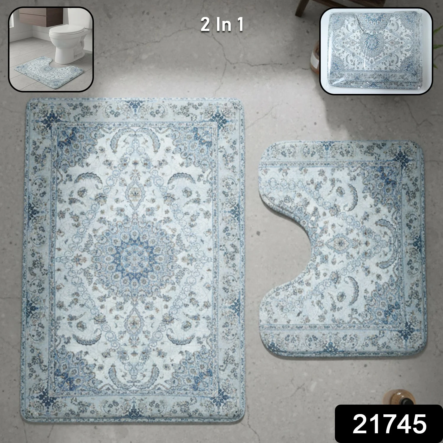 This 2 in 1 bathroom mat set is thoughtfully designed to enhance the appearance and comfort of your bathroom space while offering practical floor protection. The set includes one rectangular floor mat and one specially shaped toilet mat, making it suitable for placement around the toilet area and washroom floor. Featuring an elegant patterned design, these mats add a refined decorative touch to modern and traditional bathrooms alike. Ideal for daily use, the mats help maintain cleanliness by covering frequently used areas and supporting a neat bathroom setup. Their versatile design allows them to blend easily with different bathroom interiors while improving overall functionality.