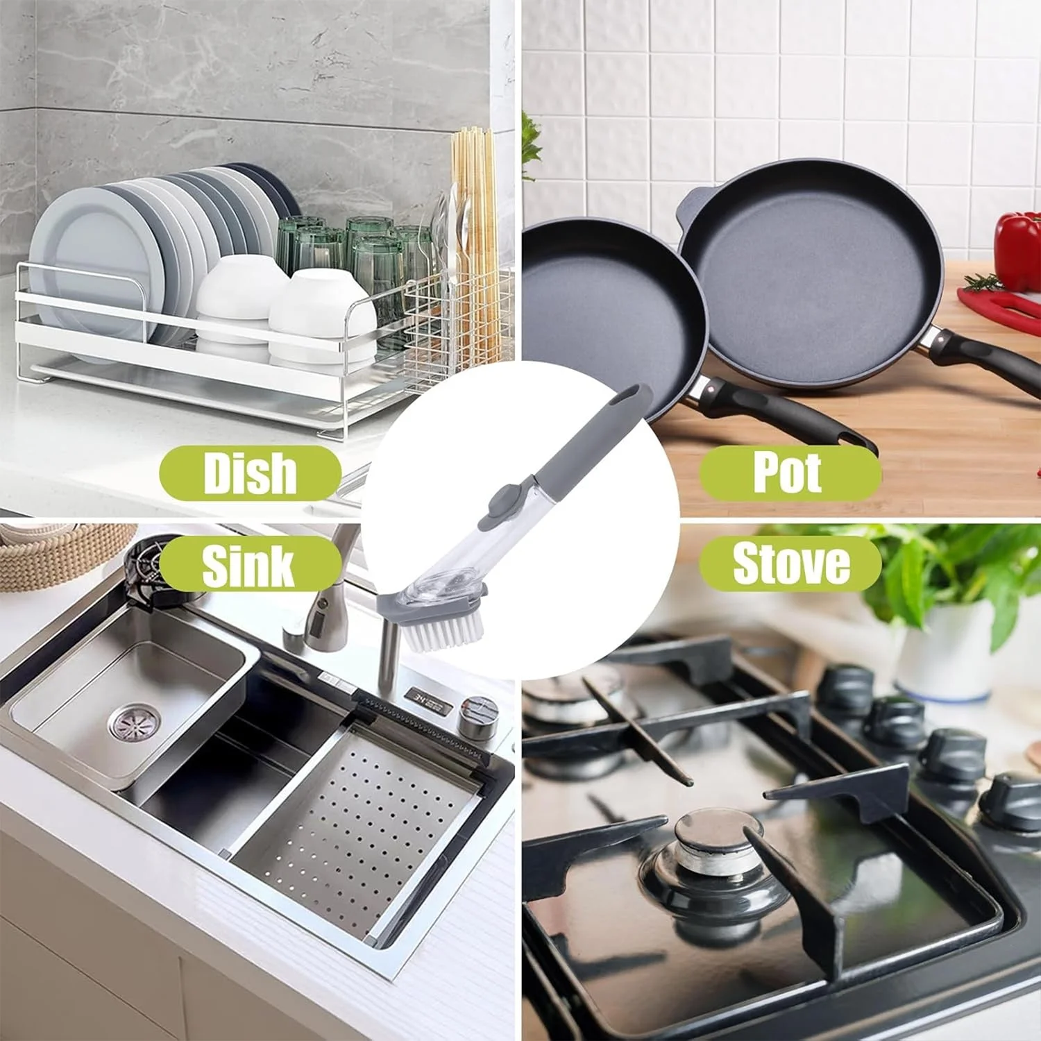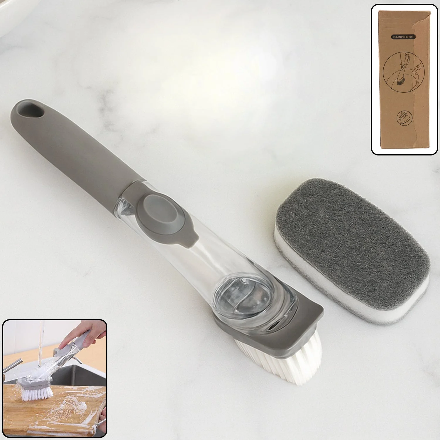 2-in-1 , soap dispensing , dish brush , refillable handle , extra scrub sponge , utensil brush, pan brush , sink cleaning , tile cleaning , scrubbing brush , multi-purpose,easy refill, dishwashing brush , household cleaning , kitchen scrubber , durable bristles , cleaning tool