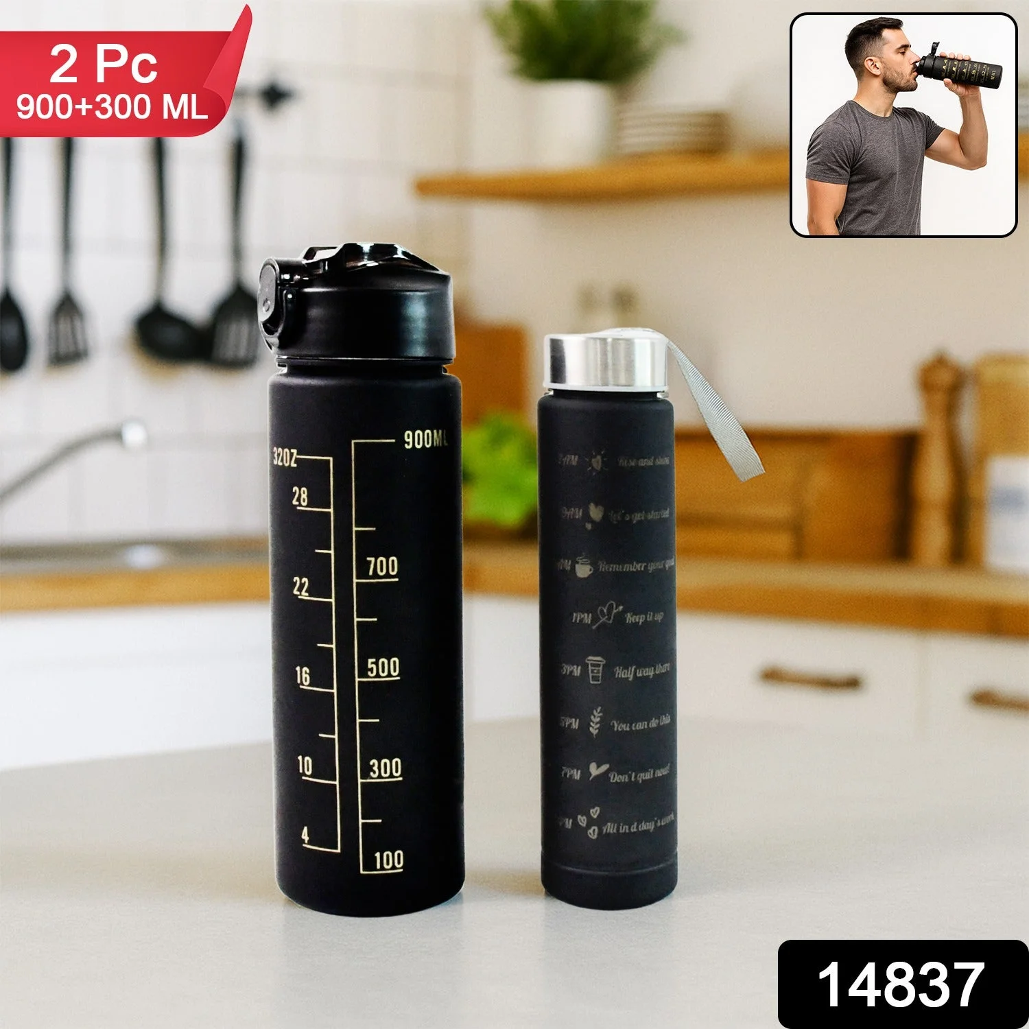 2 Pc Premium Black Motivational Water Bottle Set (900 ML + 300 ML) – Leakproof Sports & Office Sipper Bottles with Measurement Scale and Carry Strap