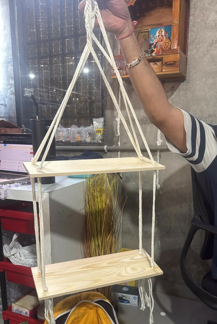 Enhance your home décor with this elegant 2-tier wooden hanging shelf designed with strong ropes and a stylish wooden ring mount. The minimalist design adds a modern boho touch to any space while providing practical storage and display. The two sturdy wooden shelves allow you to showcase small plants, candles, photo frames, books, or decorative items. Perfect for living rooms, bedrooms, balconies, cafés, or office décor, this hanging shelf combines functionality with aesthetic charm.