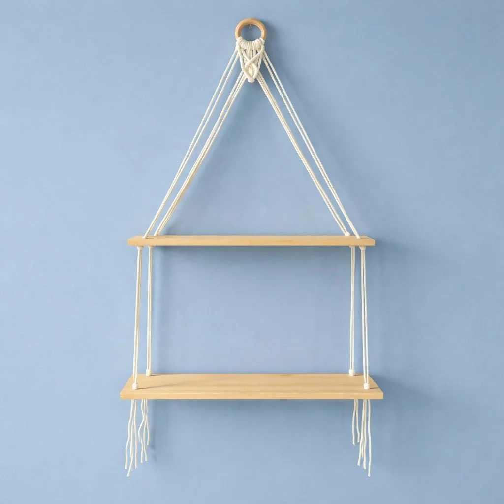 wooden hanging shelf, 2 tier wall shelf, rope hanging shelf, plant display shelf, wall décor shelf, wooden rope shelf, hanging plant shelf, boho wall shelf, decorative wall rack, macrame shelf, wall hanging shelf, wooden display shelf, home décor wall shelf, floating rope shelf, plant stand wall shelf