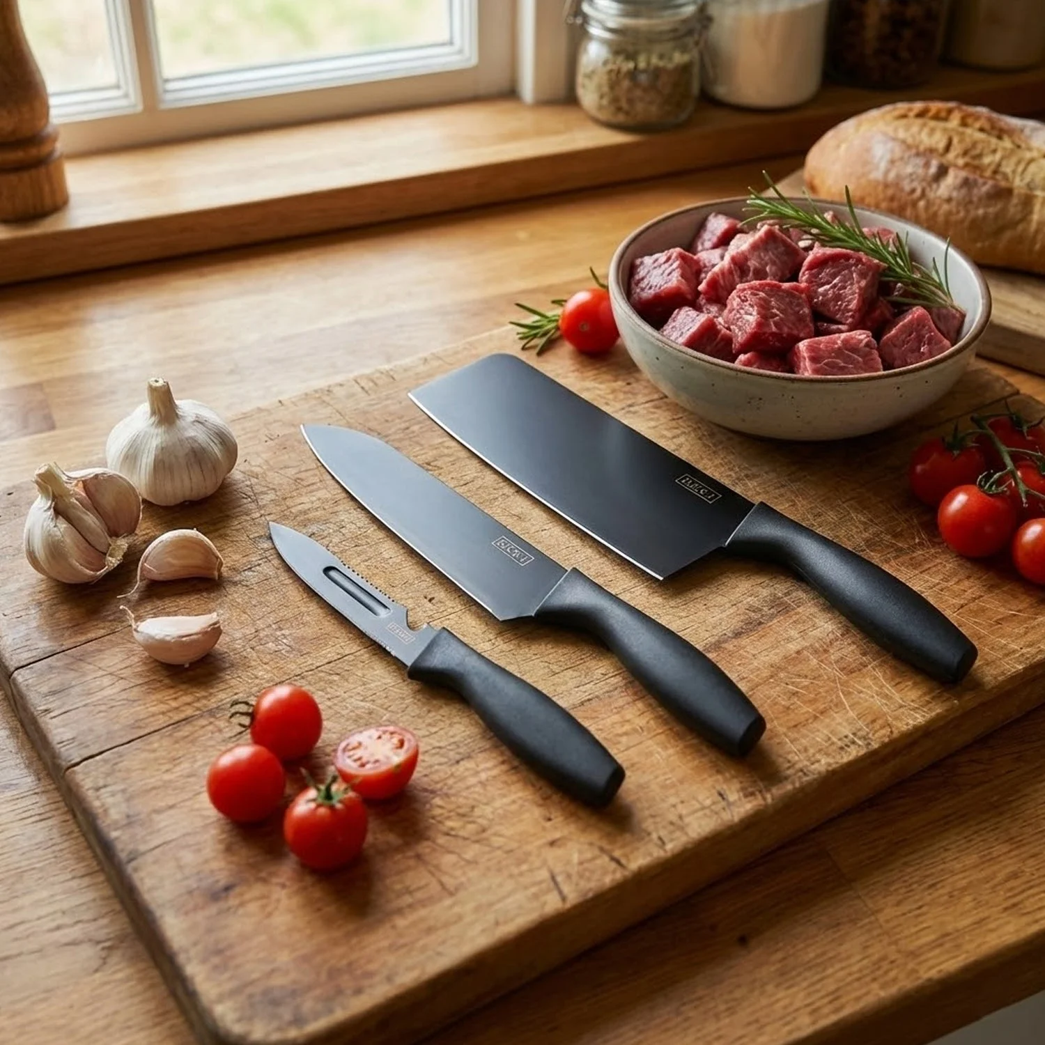 3-in-1 kitchen knife set, professional knife set, chef knife, cleaver knife, utility knife, precision cutting knives, chopping knife set, everyday kitchen knives, food preparation knives, multipurpose kitchen knives, stainless steel knife set, sharp kitchen knives, cooking knife set, professional chef knives, versatile kitchen knives, durable knife set