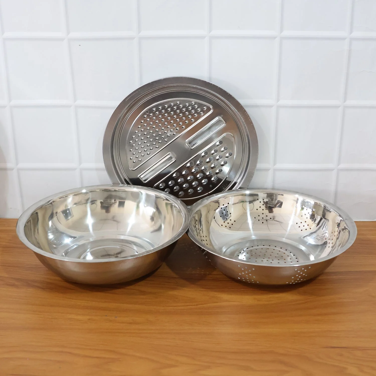 3-in-1 mixing bowl set, Stainless steel mixing bowls, Multifunction kitchen bowl, Straining and draining bowl, Grater and mixing bowl, Fruit and vegetable prep bowl, Kitchen utensil set, Washing and draining bowls, Vegetable grater bowl, Multipurpose kitchen bowls, Stainless steel colander set, Mixing and straining bowl