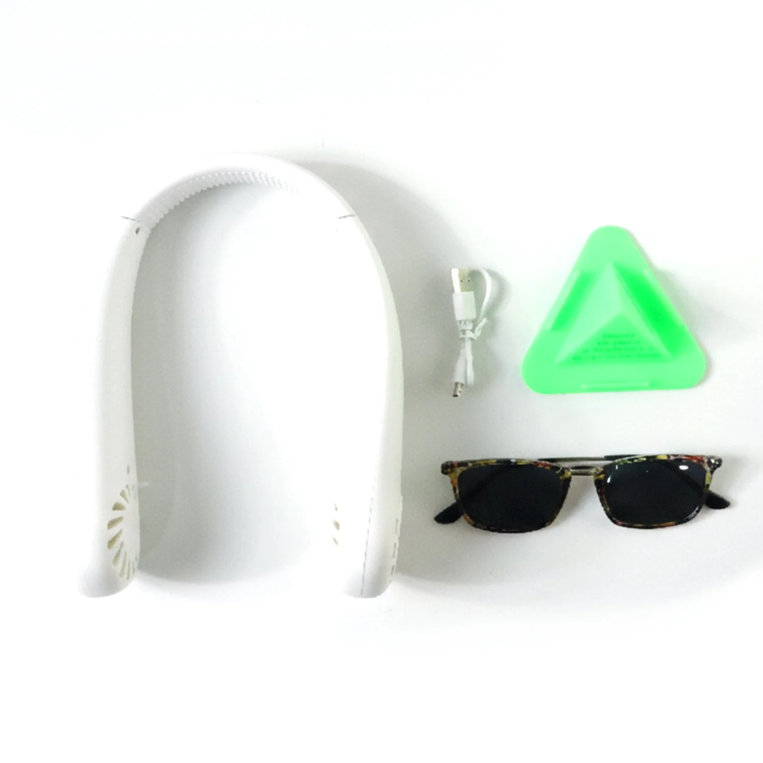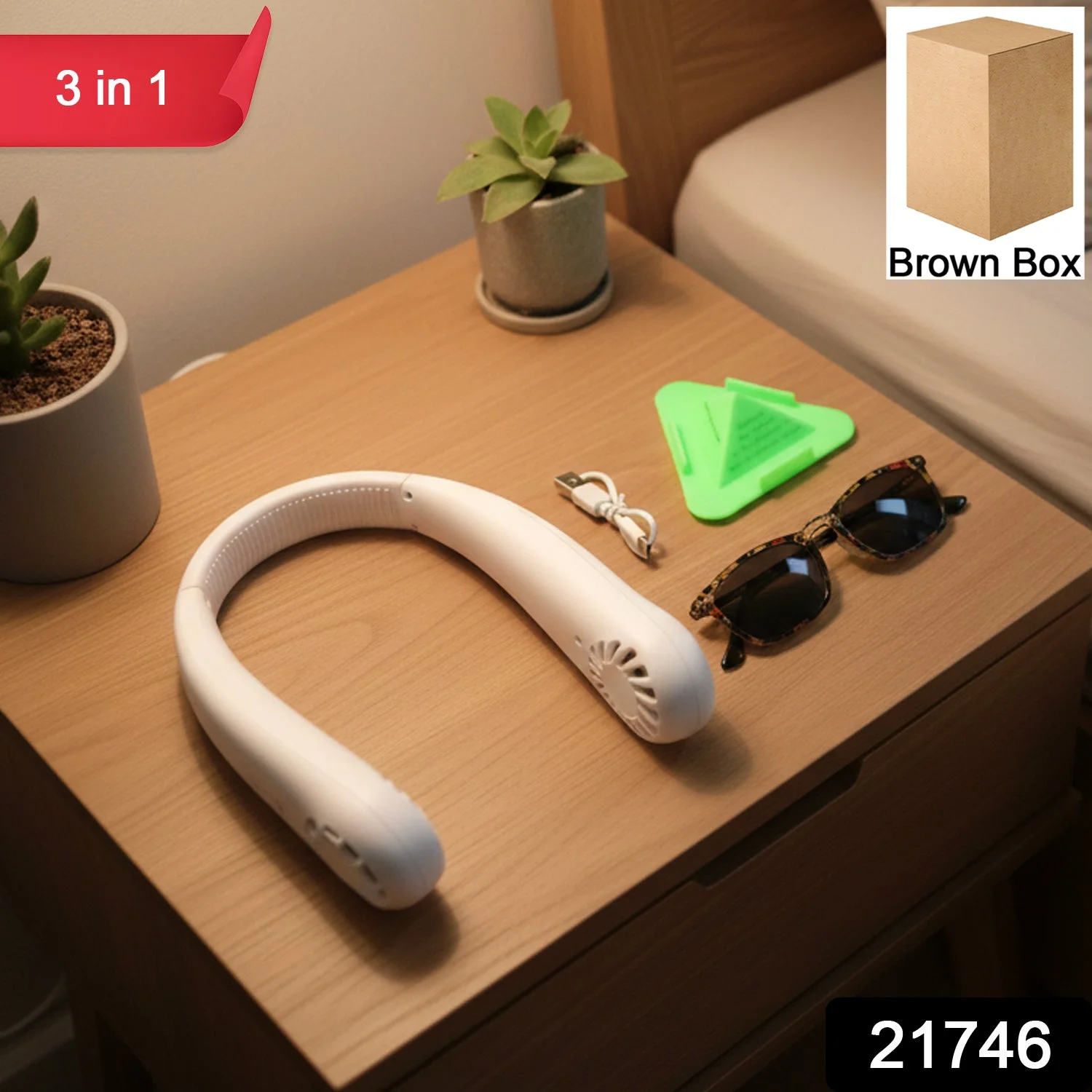 3 in 1 travel essentials combo, wearable neck fan, foldable mobile stand, USB charging cable, daily travel accessory set, office travel gadgets, home convenience tools, outdoor portable gadget set, compact travel kit, multipurpose travel accessory, portable neck fan and mobile stand, mobile device holder, travel charging cable, ergonomic travel gadget set