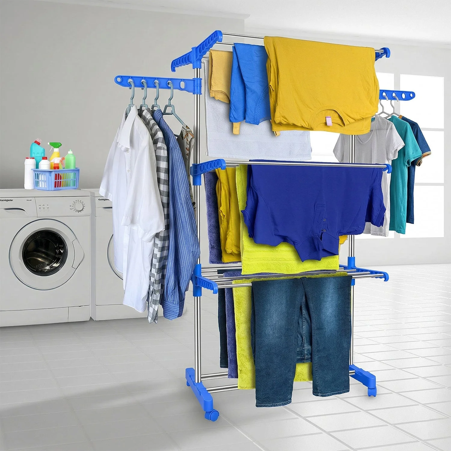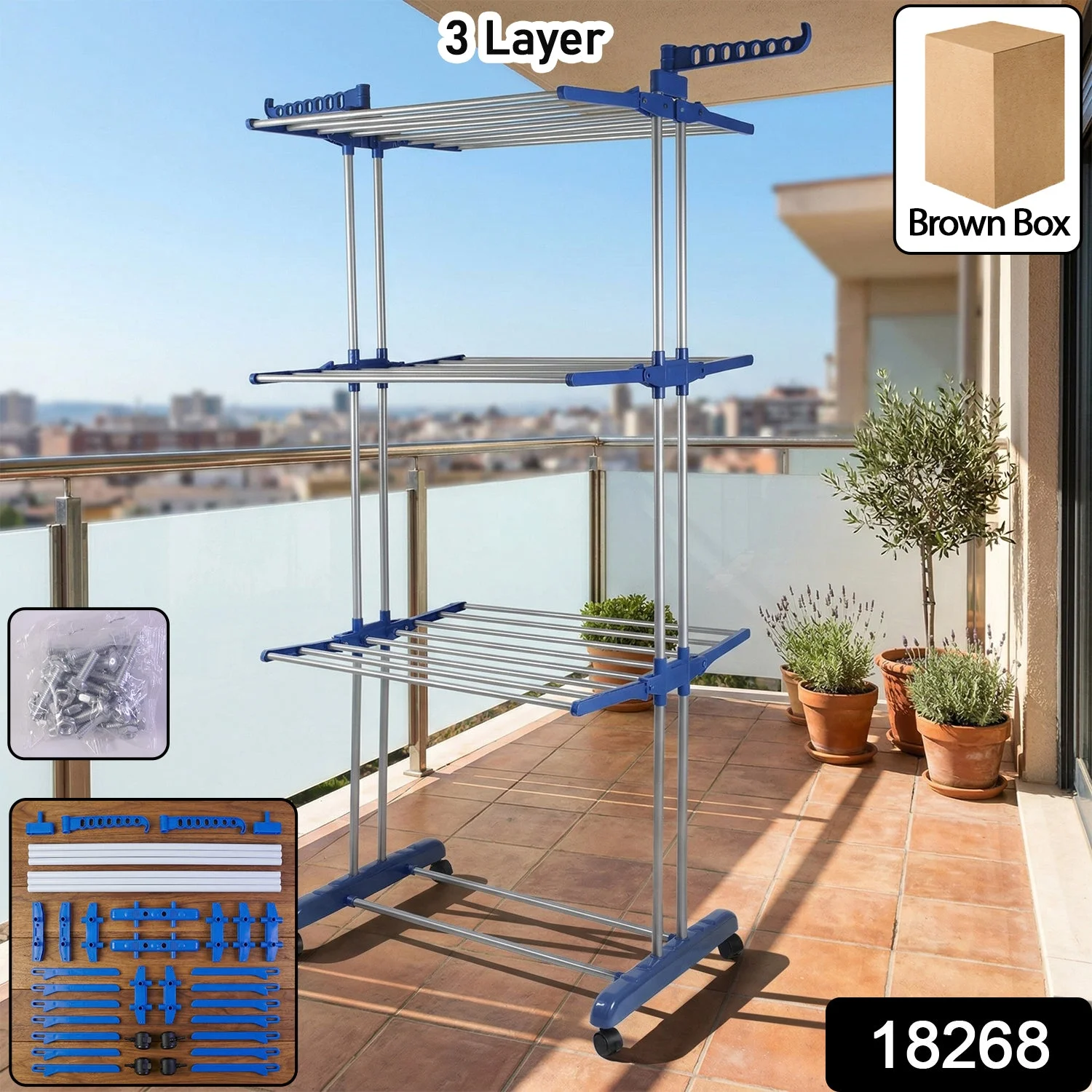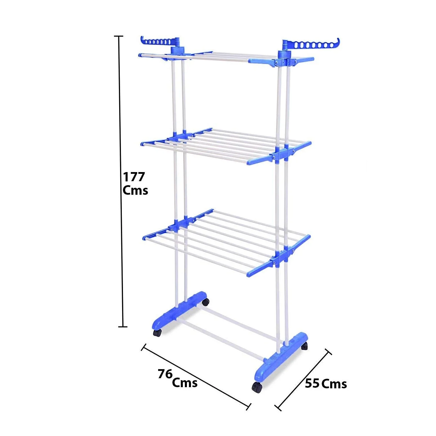 Efficiently dry your clothes with this 3-layer foldable drying stand designed for maximum space utilization and convenience. Built with multiple tiers, it provides ample space to hang clothes, towels, and garments in an organized manner. The sturdy frame ensures durability while the lightweight design makes it easy to move and reposition. Equipped with wheels, it allows smooth mobility across different areas such as balconies, terraces, or indoor spaces. Its foldable structure makes storage simple when not in use, making it a practical solution for modern homes.