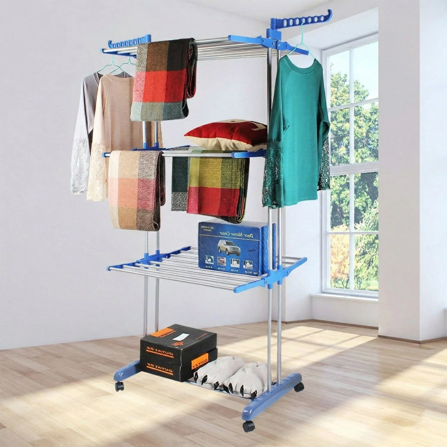 3 Layer Foldable Clothes Drying Stand with Wheels Multi-Tier Laundry Drying Rack Portable Balcony Indoor Outdoor Cloth Hanger Stand 1 Pc