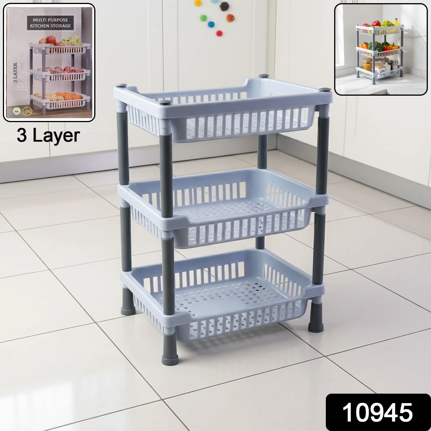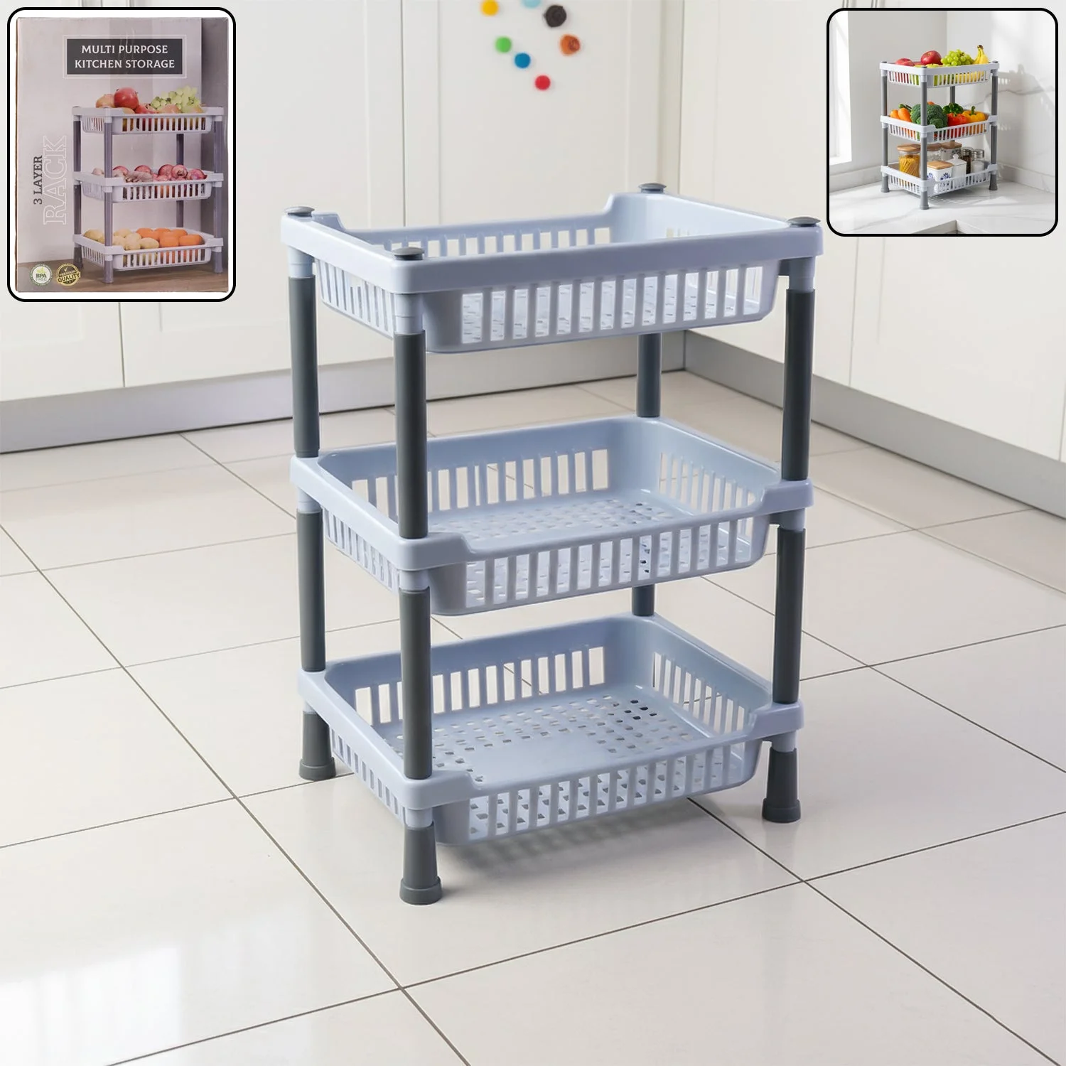 Declutter counters and corners with this 3-layer multipurpose storage basket rack. The open, ventilated baskets keep produce fresh and visible while the high-strength pillars and firm locking design provide a stable, wobble-free stand. Each tier is easy to access from the front for quick loading and unloading of fruits, vegetables, packets, jars, and cleaning supplies. The rack assembles in minutes without tools, is lightweight to move for cleaning, and fits neatly beside refrigerators, under counters, or in utility areas. Durable, moisture-resistant construction makes it ideal for everyday kitchen use while also working beautifully in bathrooms, kids’ rooms, offices, or shops.