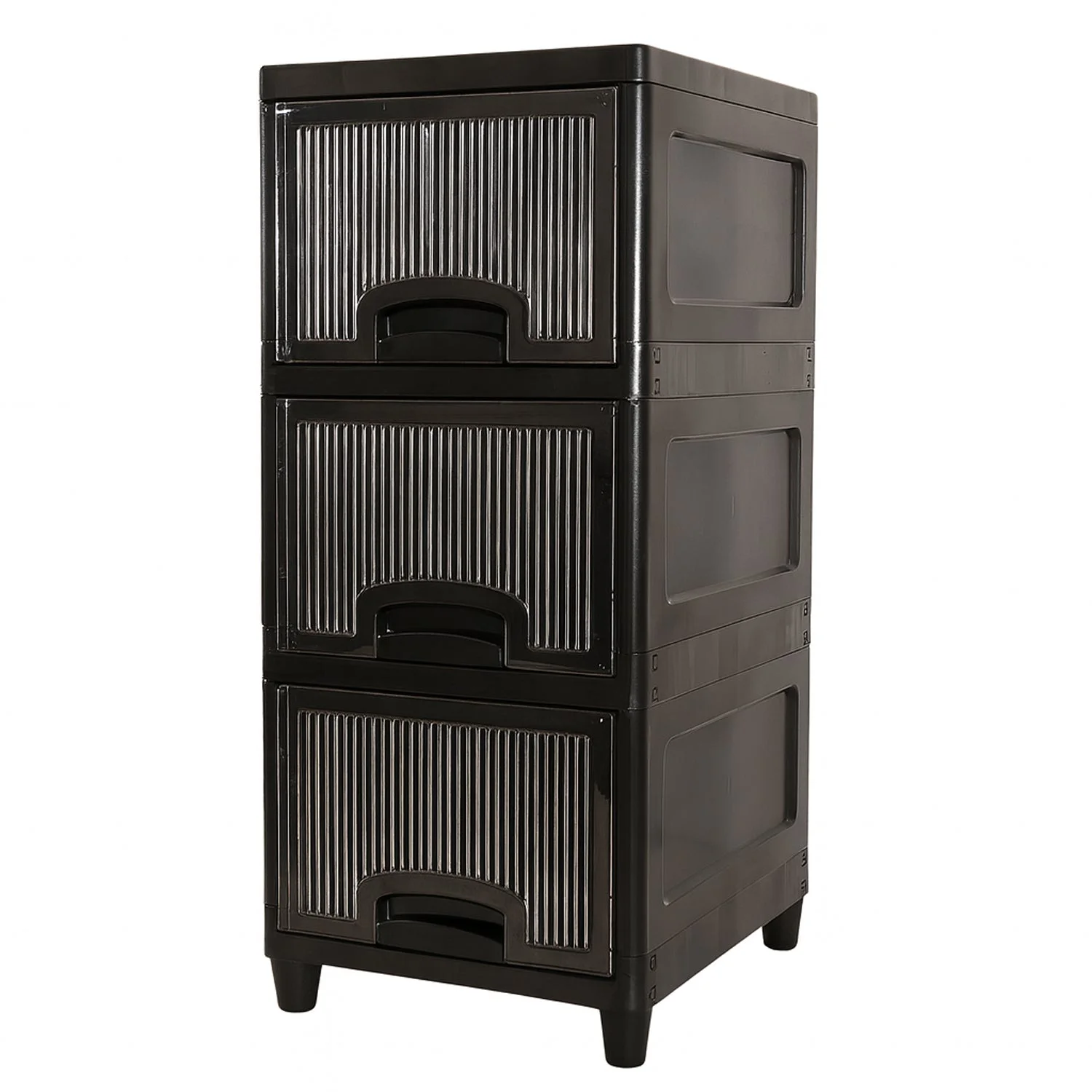 Tidy up any corner with this compact 3-tier drawer cabinet. Built from sturdy, high-density plastic, it combines a strong frame with smooth, pull-out drawers that have clear ribbed fronts—so you can see what’s inside without opening. The footprint fits comfortably beside wardrobes, study tables, or in entryways, while raised, anti-skid legs keep the unit stable and easy to clean under. Arrives ready to use (no tools required). Ideal for folded garments, kids’ toys, documents, linens, and more.