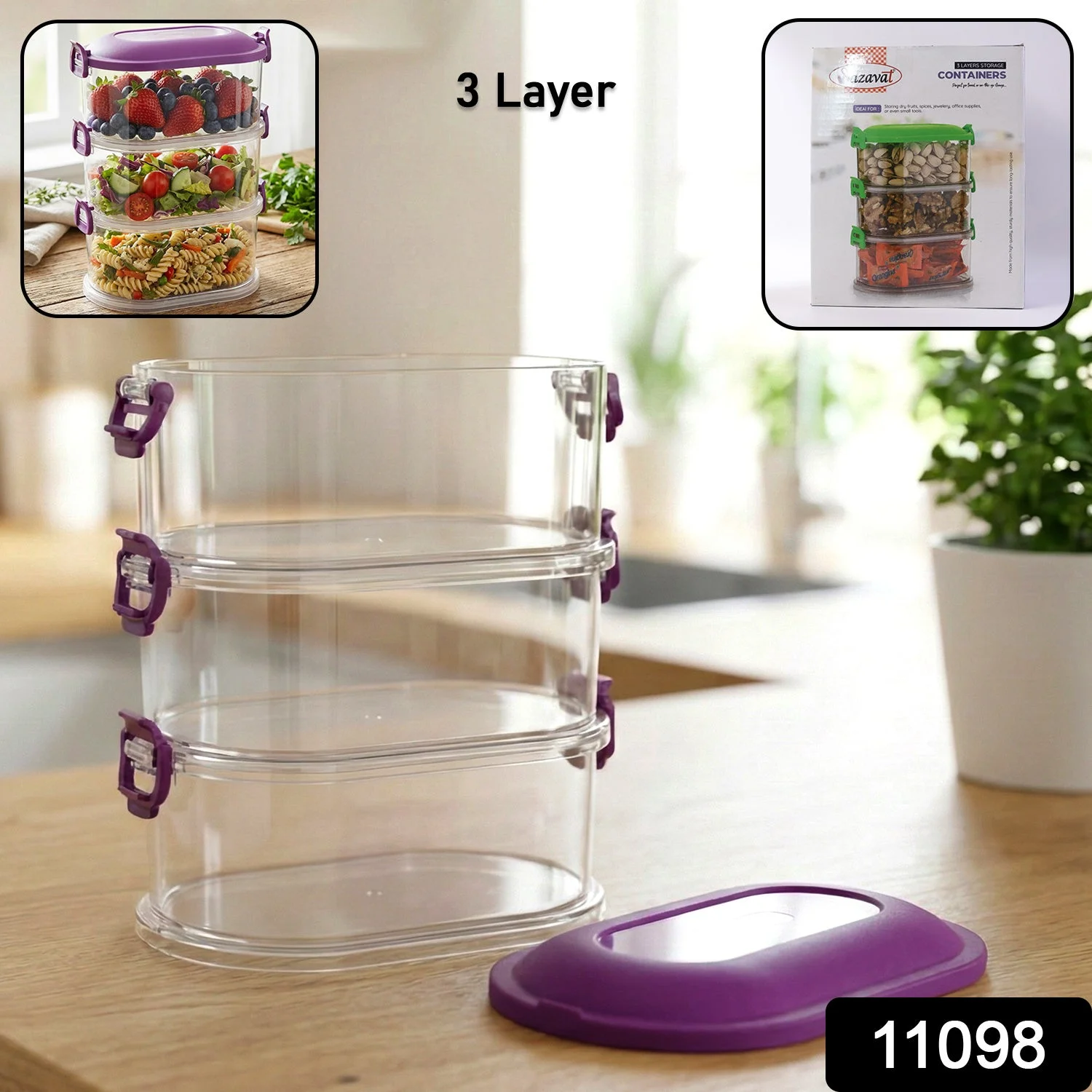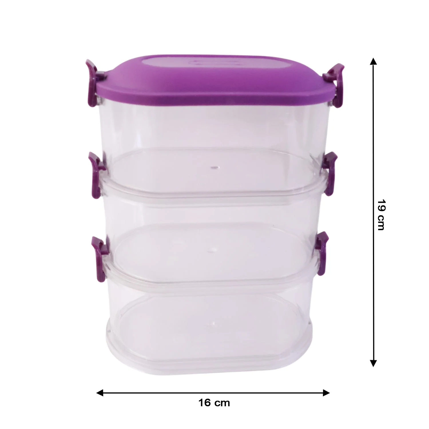 This 3 layer stackable food storage container set is a practical and space-saving solution for organizing a wide variety of food items in the kitchen. Designed with individual containers that stack neatly, it helps keep ingredients separated, fresh, and easy to access. The secure locking lids create an airtight seal that supports freshness and hygiene while preventing spills. Ideal for storing dry snacks, fruits, salads, leftovers, and prepared ingredients, this container set simplifies meal prep and kitchen organization. Its transparent design allows quick identification of contents, making it suitable for everyday household use.