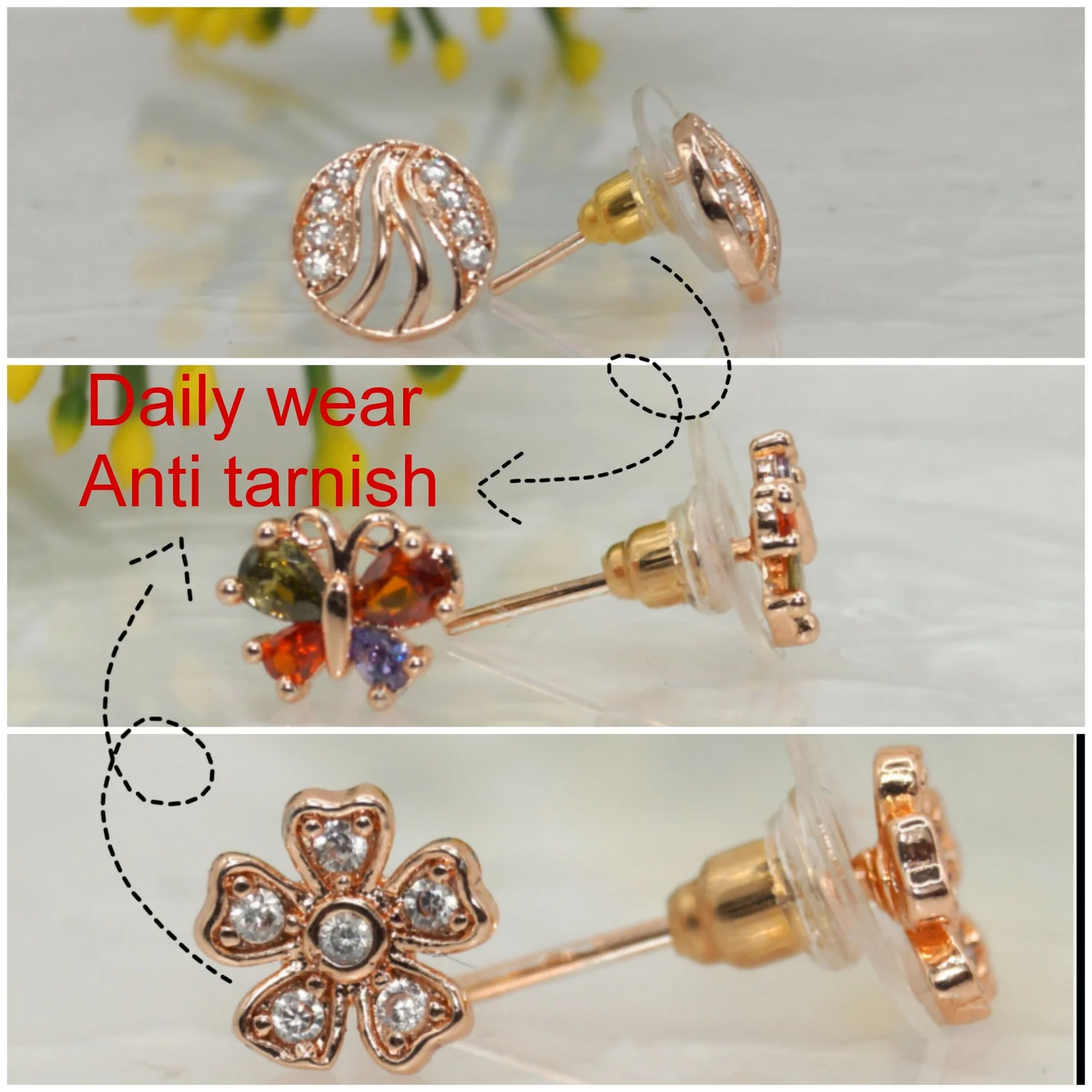 Be the first to review 3-Pair Rose Gold Stud Earring Set - Flower, Swirl, Butterfly for women and girls Combo Pack of 3!