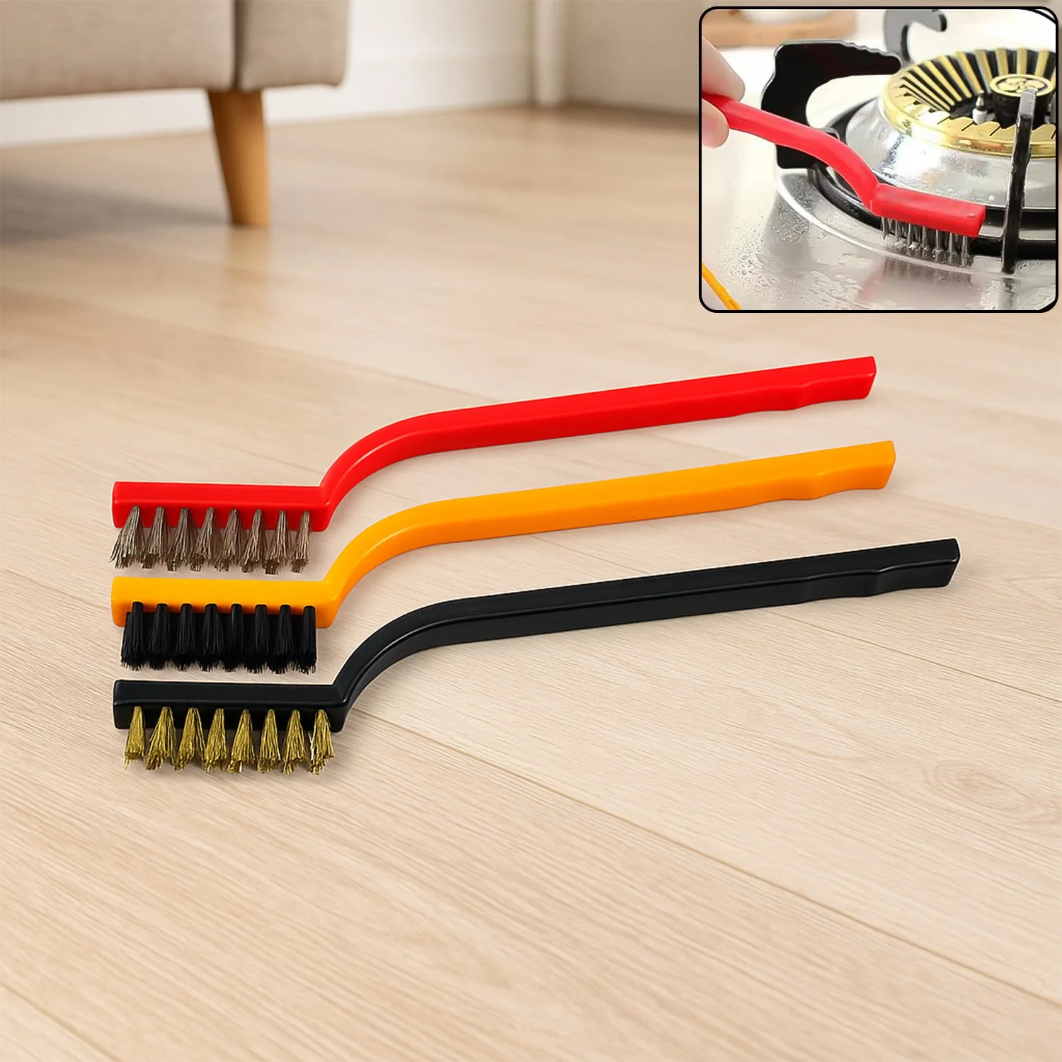 2166 3pc Mini Wire Brush Set Brass Nylon Stainless Steel Bristles Household Cleaning Brush for Gas Stove, Smoke Machine Tool Burner Tiles Tap Rust Removal Welding Slag Dirt & Paint Scrubbing.