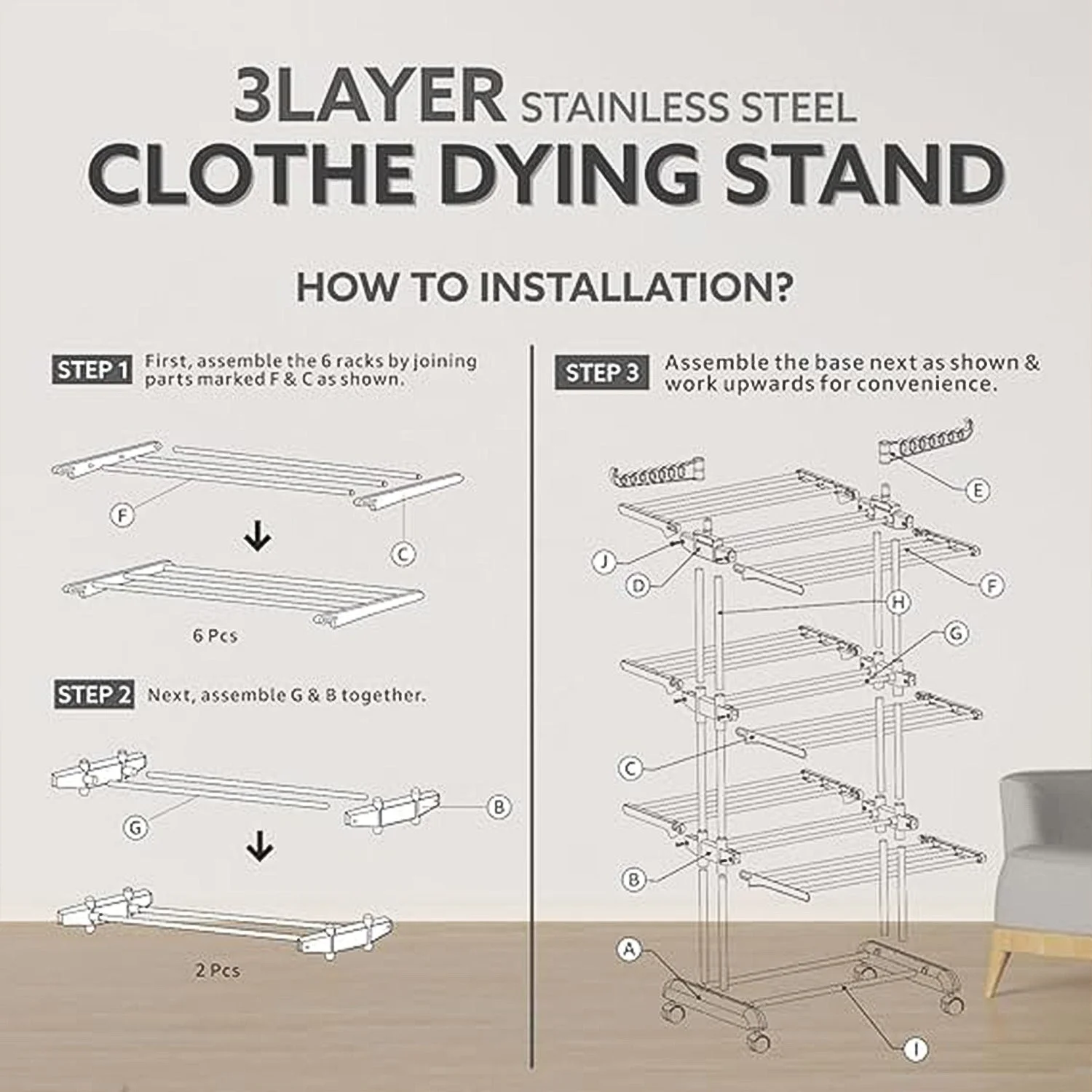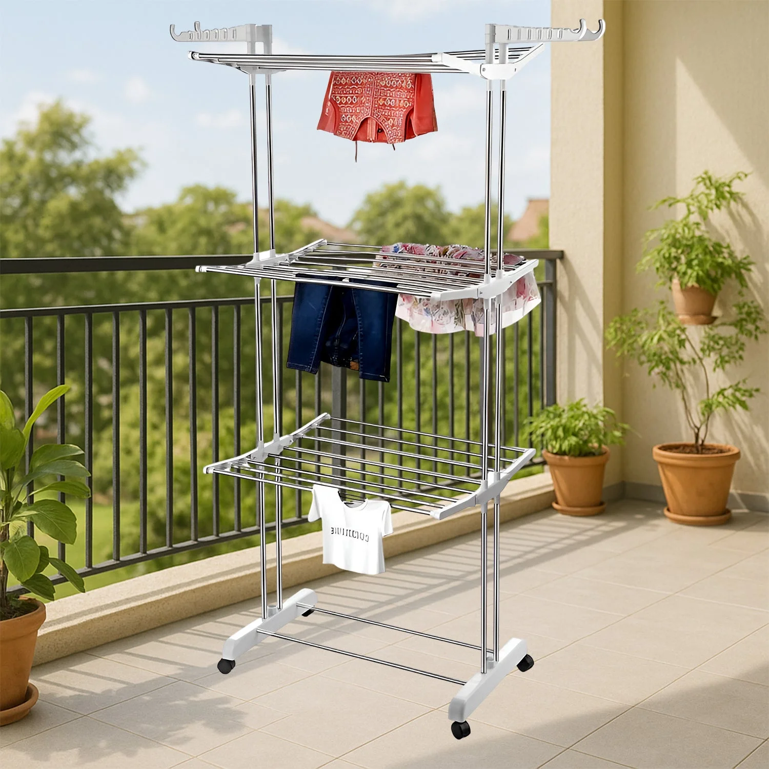 3-Tier Foldable Stainless Steel Cloth Drying Stand with Wheels – Heavy-Duty, Portable, Multi-Layer Laundry Rack for Indoor & Outdoor Use 3 Layer