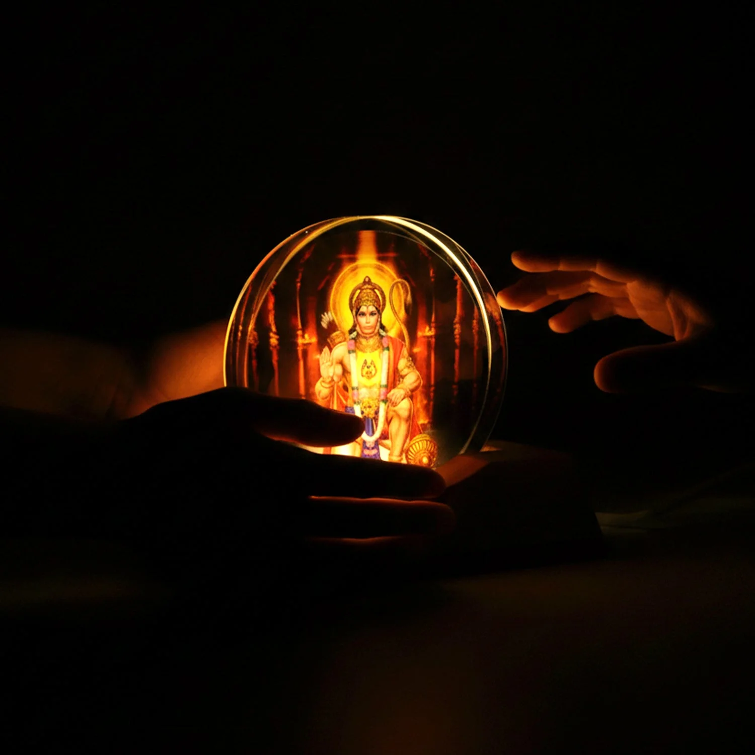 Bring divine energy and peaceful ambience to your space with this beautiful 3D Hanuman Ji Acrylic Night Lamp. Designed with a premium engraved acrylic plate and a stylish wooden base, this lamp creates a glowing 3D illusion effect that looks elegant in any room. The warm light makes it perfect for your home temple, bedside table, office desk, or meditation corner. It is lightweight, easy to use, and runs on USB power, making it convenient for daily use. A perfect decorative item as well as a meaningful gifting option for festive occasions.