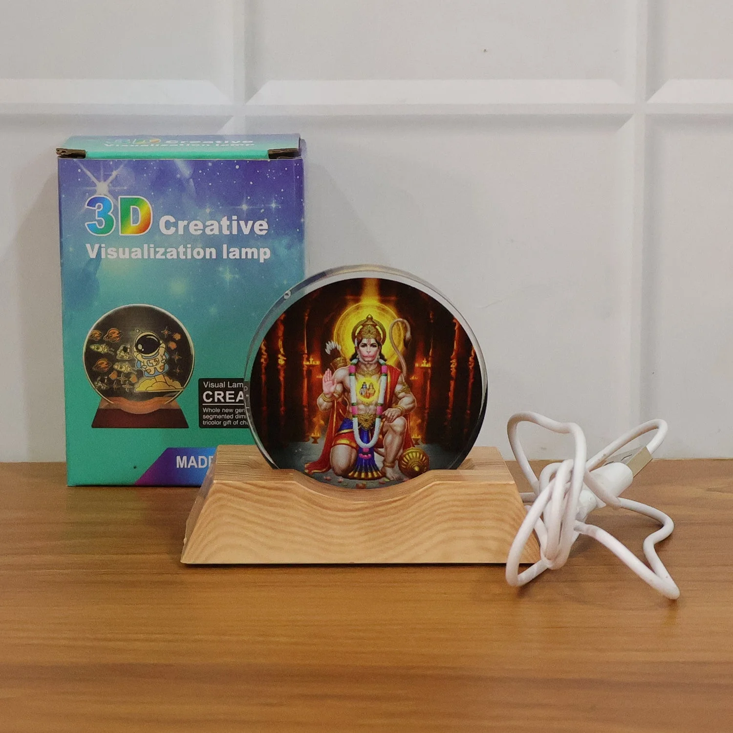 3D Creative Hanuman Ji Acrylic LED Night Lamp with Wooden Base Stand, Warm Glow Decorative Table Light for Home Temple, Bedroom & Gift Purpose, USB Powered 3D Illusion Lamp (1 Pc)