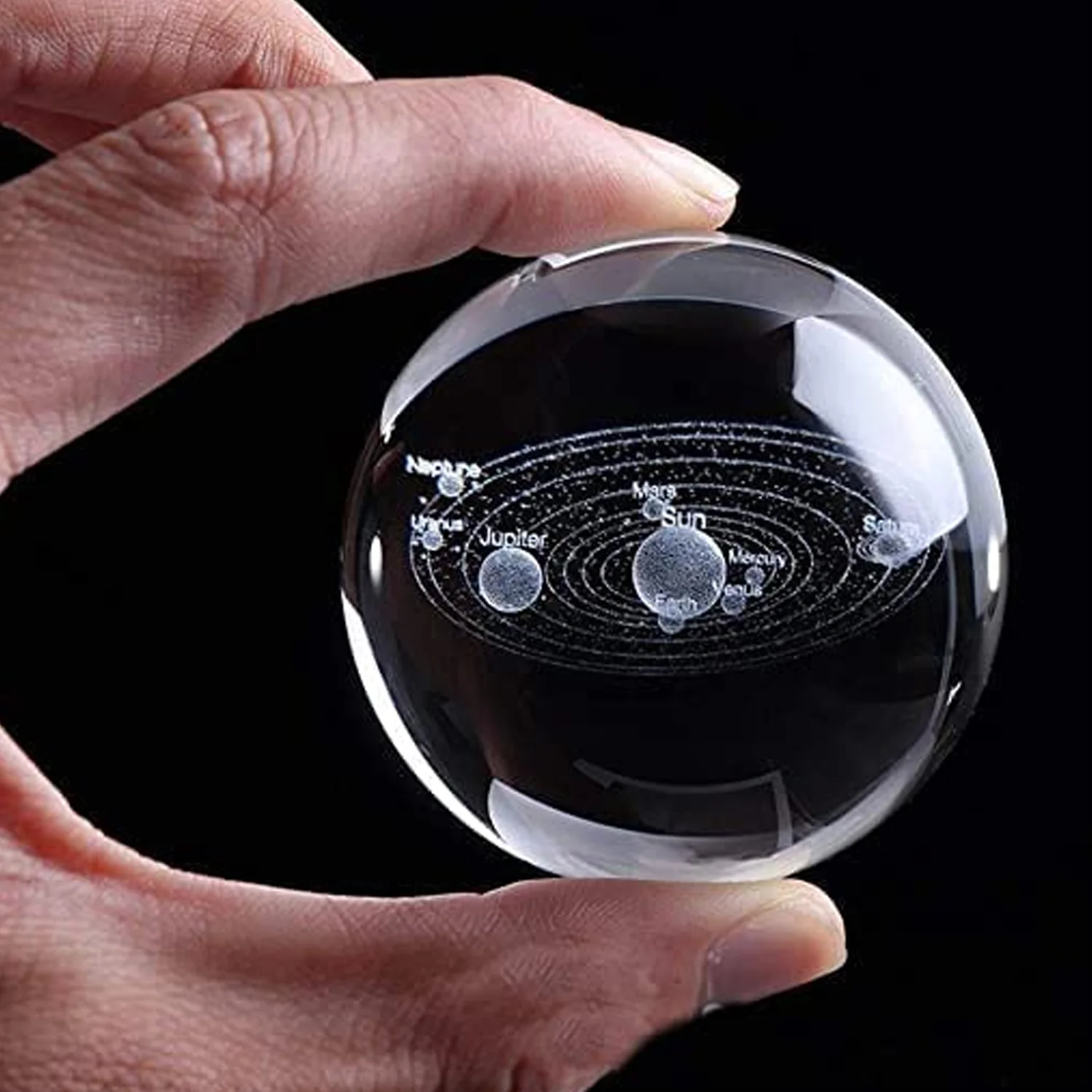 This 3D crystal ball night lamp is a beautifully crafted decorative lighting piece. When illuminated, the detailed planetary engraving glows warmly, creating a soothing and magical ambiance in any space. The lamp is mounted on a sturdy wooden base that enhances its premium look and ensures stable placement on tables or shelves. Powered via USB, it offers energy-efficient illumination suitable for long hours of use without overheating. Ideal as both a night lamp and a decor accent, this crystal ball light adds elegance to bedrooms, living rooms, offices, and gifting occasions.