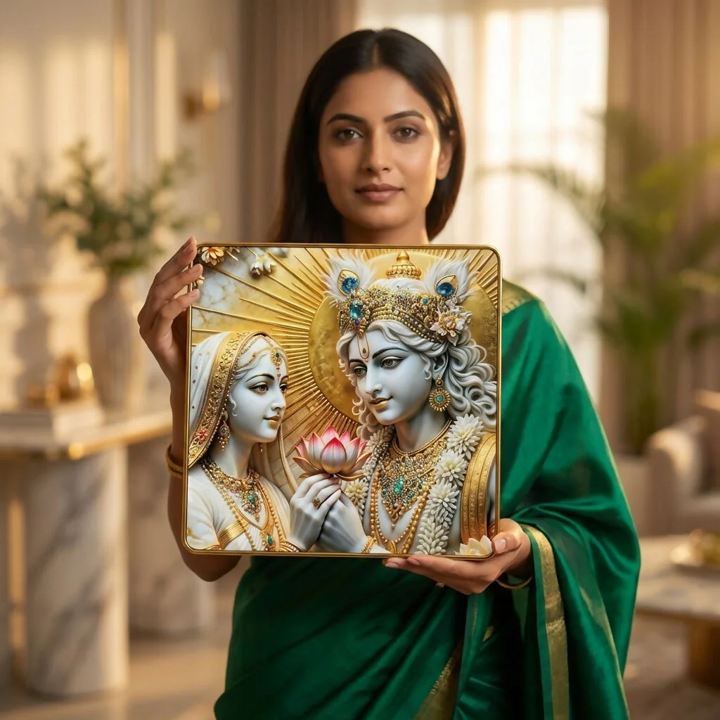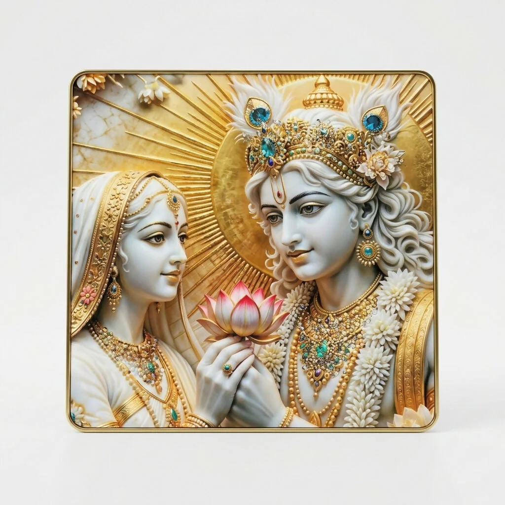 Bring a sense of divine elegance and spiritual harmony into your space with this beautifully designed AI finishing 3D Radha Krishna crystal wall art. Crafted with precision, this artwork features a stunning embossed effect that creates depth and visual richness, making the figures appear lifelike and radiant. The soothing blend of white and gold tones adds a marble-like sophistication, enhancing the overall ambiance of your home. Accentuated with intricate elements like the lotus and radiant halo, it serves as a peaceful focal point in any room. Perfect for both modern and traditional interiors, this wall frame transforms your surroundings into a serene and uplifting environment.