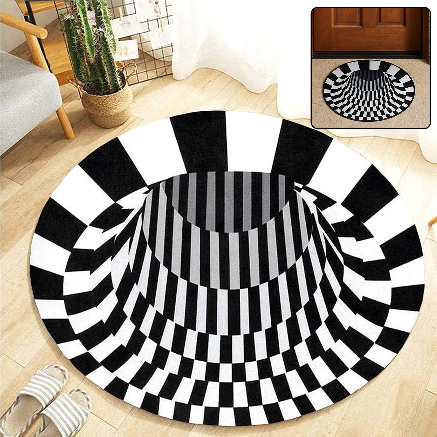 Transform any space with this statement-making round illusion rug that appears to dip into a mesmerizing vortex. The bold black-and-white checkered layout creates a 3D effect that instantly elevates modern interiors while remaining easy to maintain for everyday use. A soft-touch surface adds comfort underfoot, and the anti-skid backing helps keep the rug firmly in place on smooth floors. Place it by the door, next to the sofa, beside the bed, or in creative corners to add visual drama and playful design. Lightweight and foldable for convenient moving and storage, it lays flat quickly after unpacking and refreshes a room in seconds.