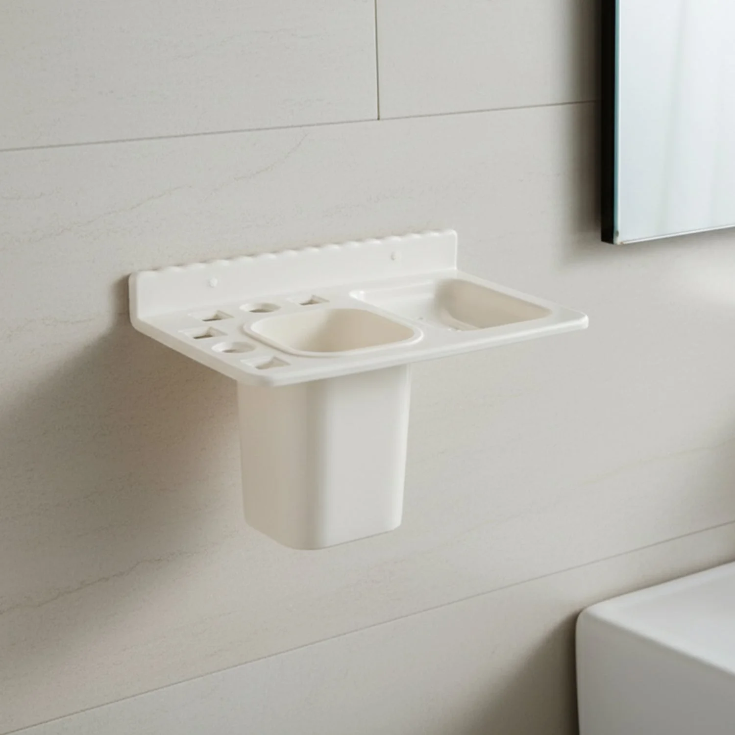 This wall-mounted multi-compartment toothbrush and soap holder is a smart and space-saving bathroom organizer designed to keep your essentials neatly arranged. It features separate compartments for toothbrushes, toothpaste, soap, and other small accessories, along with a detachable cup for rinsing or storage. Made from durable, easy-to-clean plastic, it provides a hygienic and clutter-free solution for your bathroom while ensuring quick drainage and drying. Its compact design makes it ideal for bathrooms of all sizes, and the wall-mount installation helps save valuable counter space.