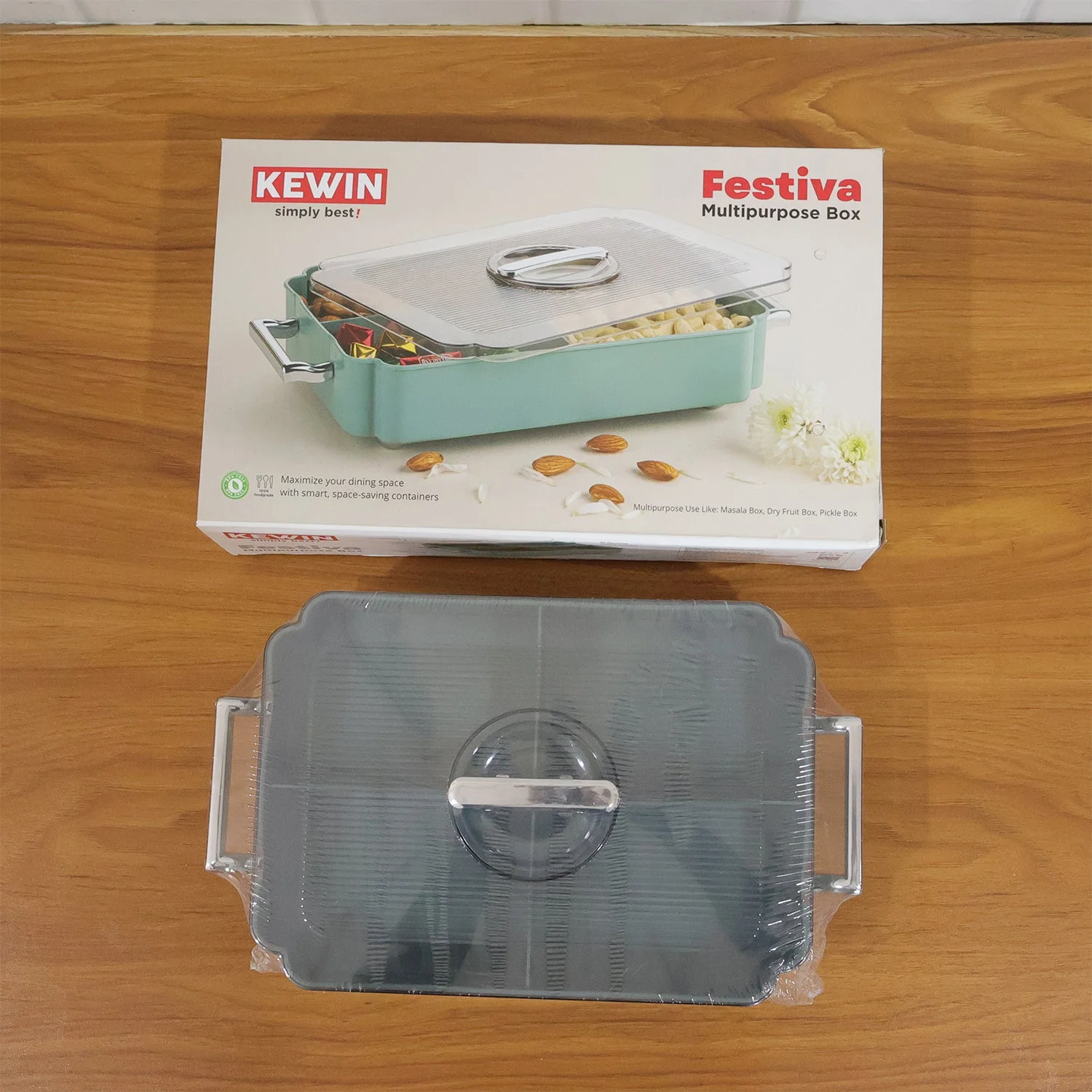 This 4 compartment multipurpose plastic storage container is designed to organize and store different food items separately in one compact box. The divided inner layout helps keep snacks, dry fruits, namkeen, sweets, and small edibles neatly arranged without mixing. A transparent lid allows easy visibility of contents while keeping items covered and protected. The sturdy side handles make it convenient to carry and move the container from kitchen shelves to dining tables or serving areas. Suitable for daily kitchen use, festive serving, and organized storage, this container combines functionality with a clean, modern design.