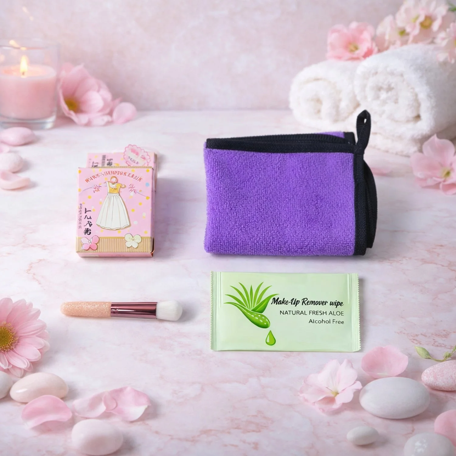 Set Contents: Makeup remover wipe, cleansing cloth, makeup brush, storage pouch