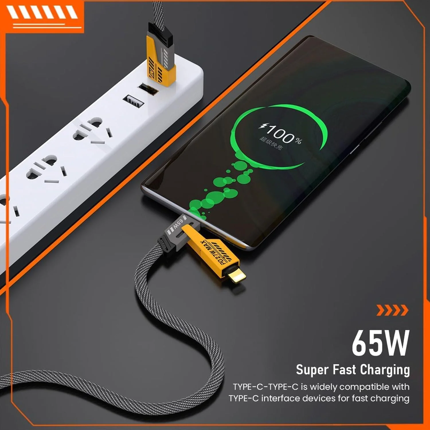 4 in 1 Fast Charging Cable With Multiport USB-C to Type C, USB-C to Lightning Adapter Cable Fast Charging Nylon Braided Charging Cable for iOS / Smartphones | 65W Cable (1 Pc / Loose)