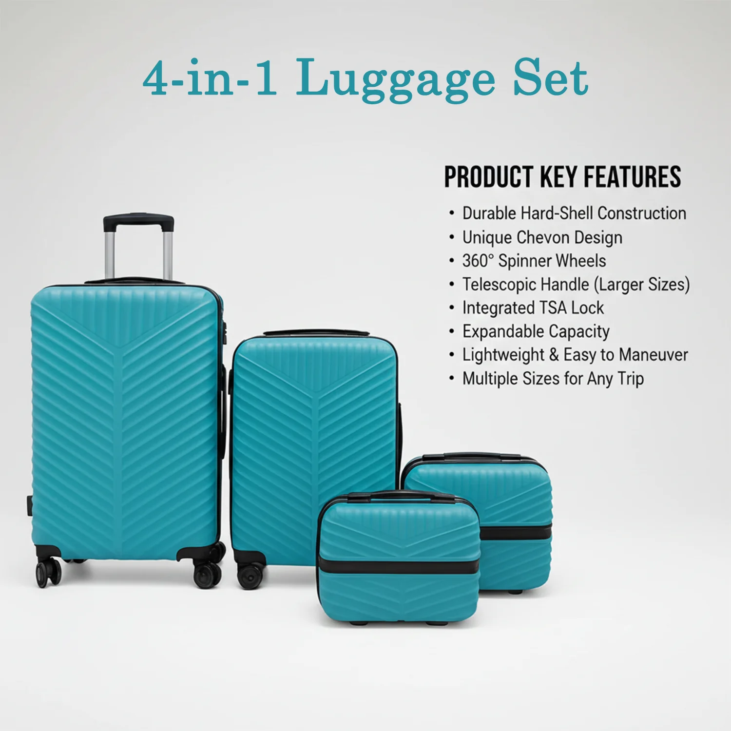 4-in-1 luggage set, hard shell suitcase set, durable luggage set, stylish travel luggage, large suitcase, medium suitcase, small suitcase, cabin size bag, travel bag set, multipiece luggage set, lightweight suitcase set, trolley luggage set, rolling luggage set, expandable suitcase set, vacation luggage set