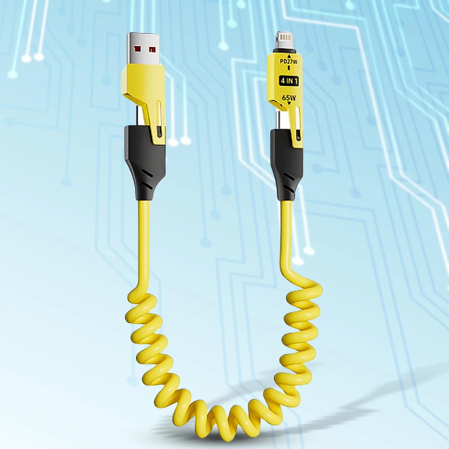 4 in 1 Spring Fast Charging Cable, 65W USB-C Multi Charging Cable for Multiple Devices, Extended Retractable Universal Charging Cable for iPhone Samsung Laptop Charging (1 Pc / 1.5 Mtr Long)