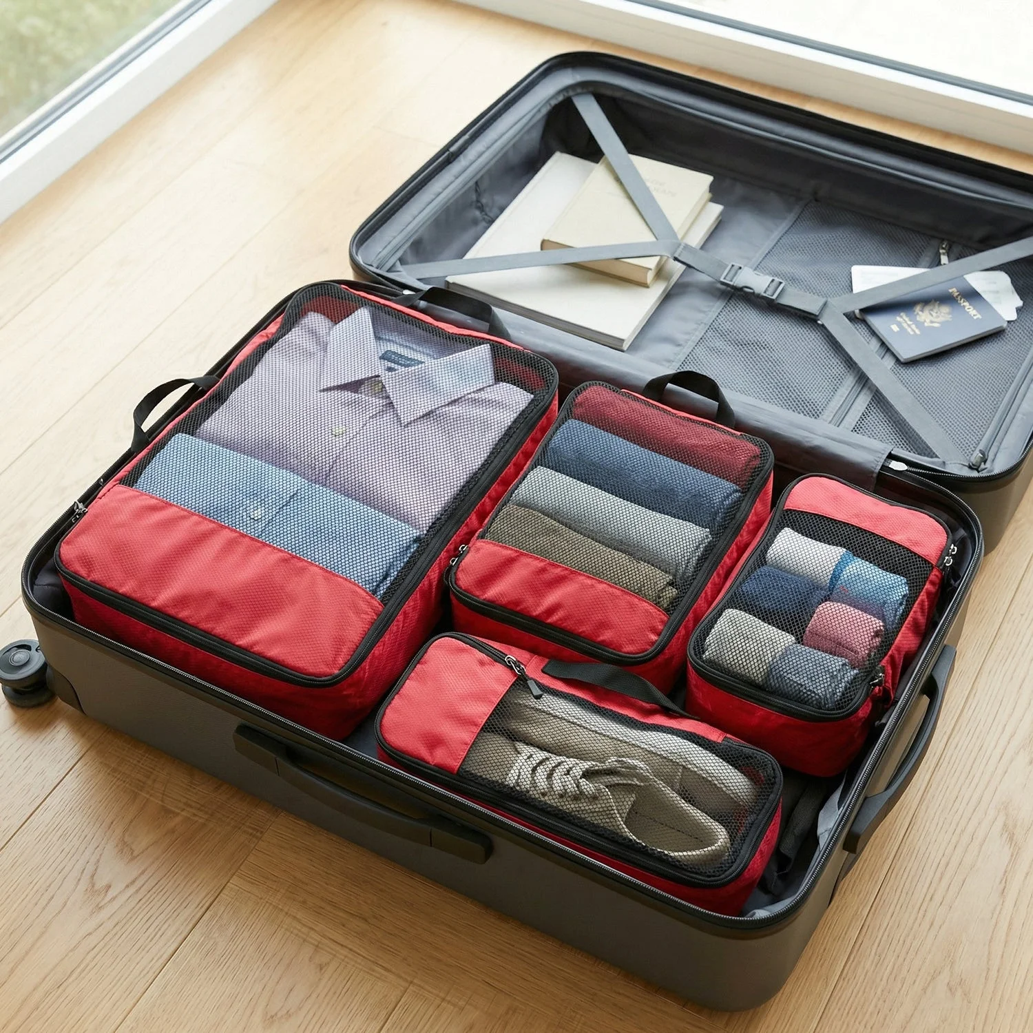 Designed for convenient storage, these luggage organizer packing cubes allow travelers to categorize clothing, accessories, and toiletries easily. The suitcase organizer storage bags help save space while keeping luggage tidy. A practical packing cube set for luggage organization.
