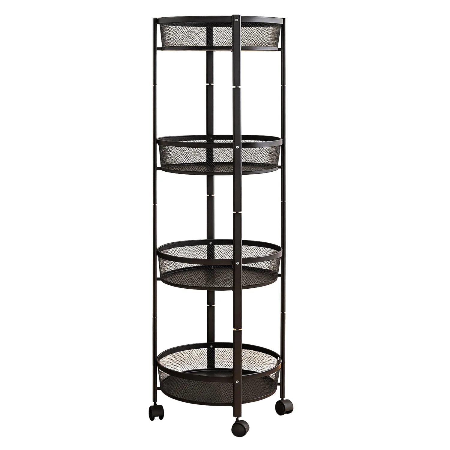 Organize your space in style with this 4-layer round metal mesh storage rack. Built with sturdy iron and finished in sleek black, this tall and slim rolling utility cart offers both functionality and aesthetic appeal. Its breathable mesh baskets are ideal for storing towels, fruits, toiletries, stationery, or kitchen items, while the 360° rotating wheels allow for easy mobility across rooms. Whether used in the kitchen, living room, bathroom, or office, this elegant storage rack keeps essentials accessible and organized without occupying much space.