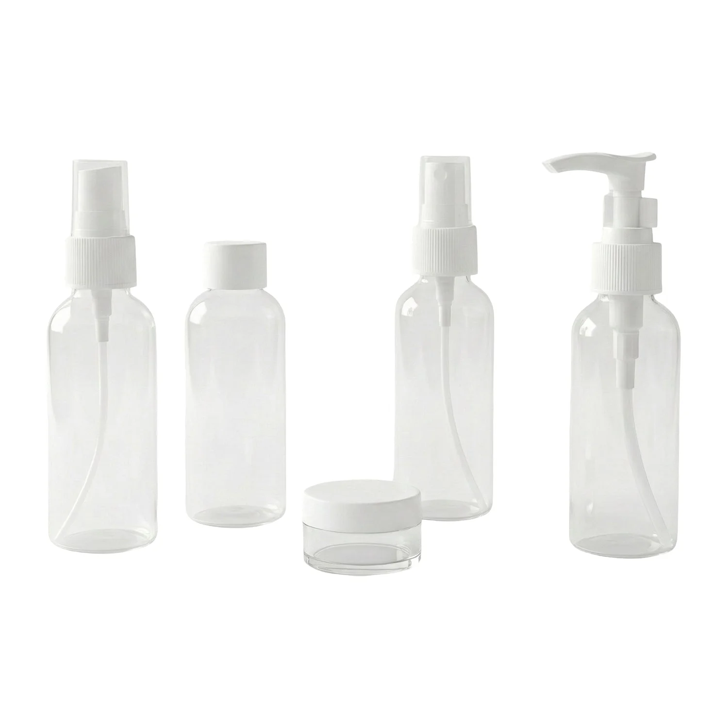 5-in-1 refillable travel cosmetic bottle set, portable toiletry containers, travel spray bottle, travel pump bottle, flip cap travel bottle, cream jar for travel, multipurpose travel bottles, travel shampoo container, lotion travel bottle, skincare travel container, makeup essentials travel set, travel size cosmetic bottles, refillable beauty bottles