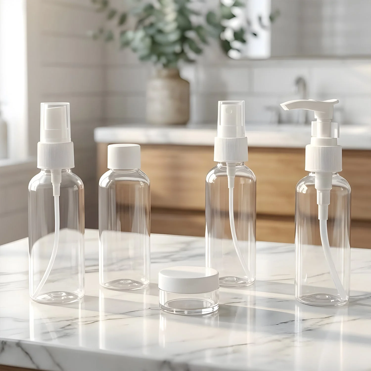 Includes spray bottle, pump bottle, flip-cap bottle, and cream jar