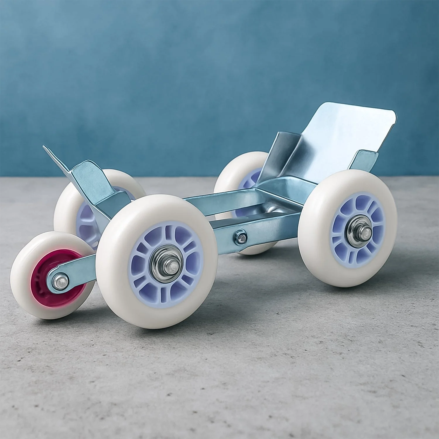Five-wheel design: one small for steering and four large for support