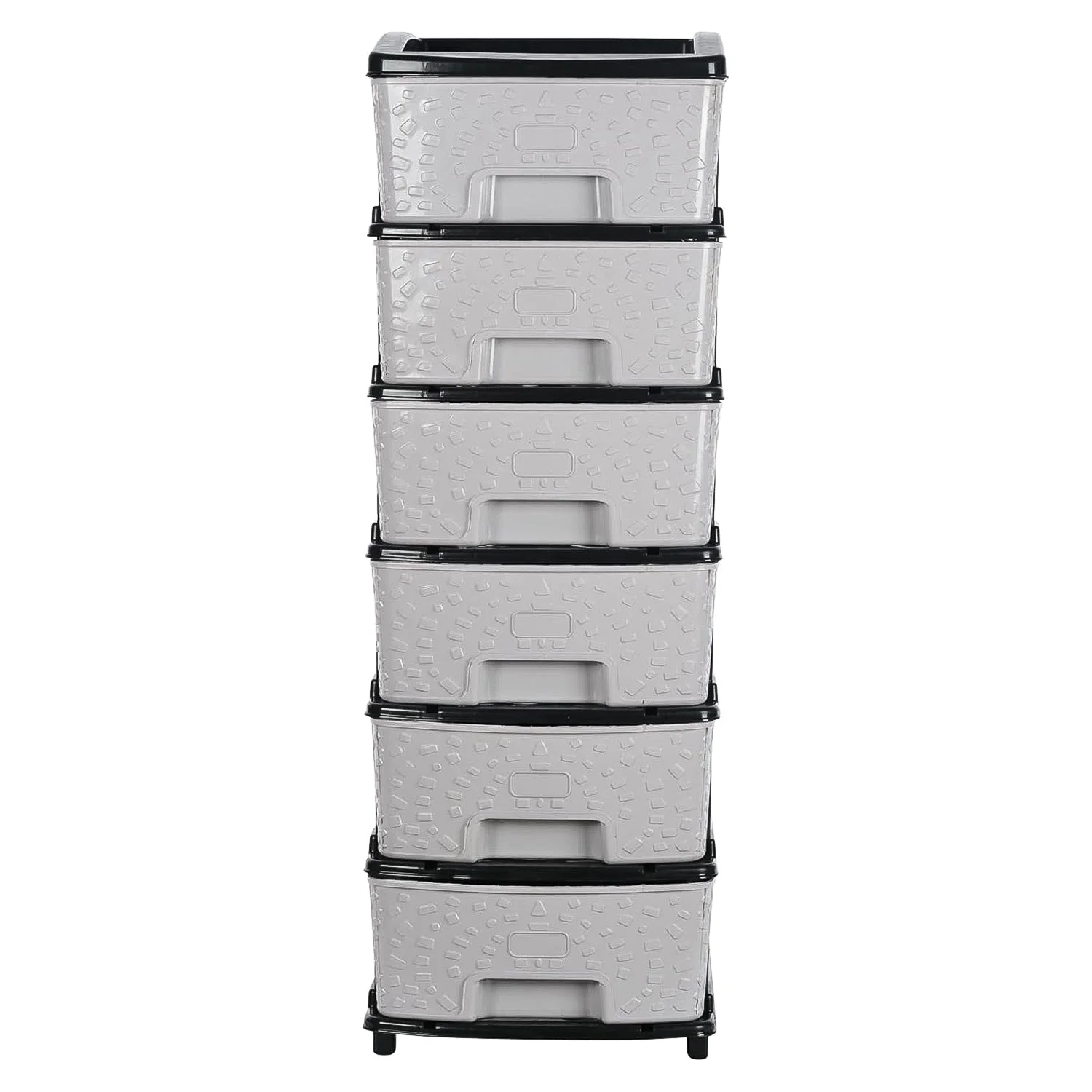 Maximize your storage efficiency with this 6-layer modular plastic drawer cabinet, crafted to combine durability with modern utility. Featuring a sturdy black plastic frame and six spacious grey drawers with a stylish embossed stone texture, this cabinet is ideal for organizing essentials in any room—be it laundry, bedroom, garage, office, or pantry. The drawers are deep, easy to pull out, and provide ample space to store clothing, documents, tools, or daily use items. The neutral grey-black combo adds a contemporary touch to your interiors. This unit is strong, functional, and designed for both light domestic and semi-heavy utility use.