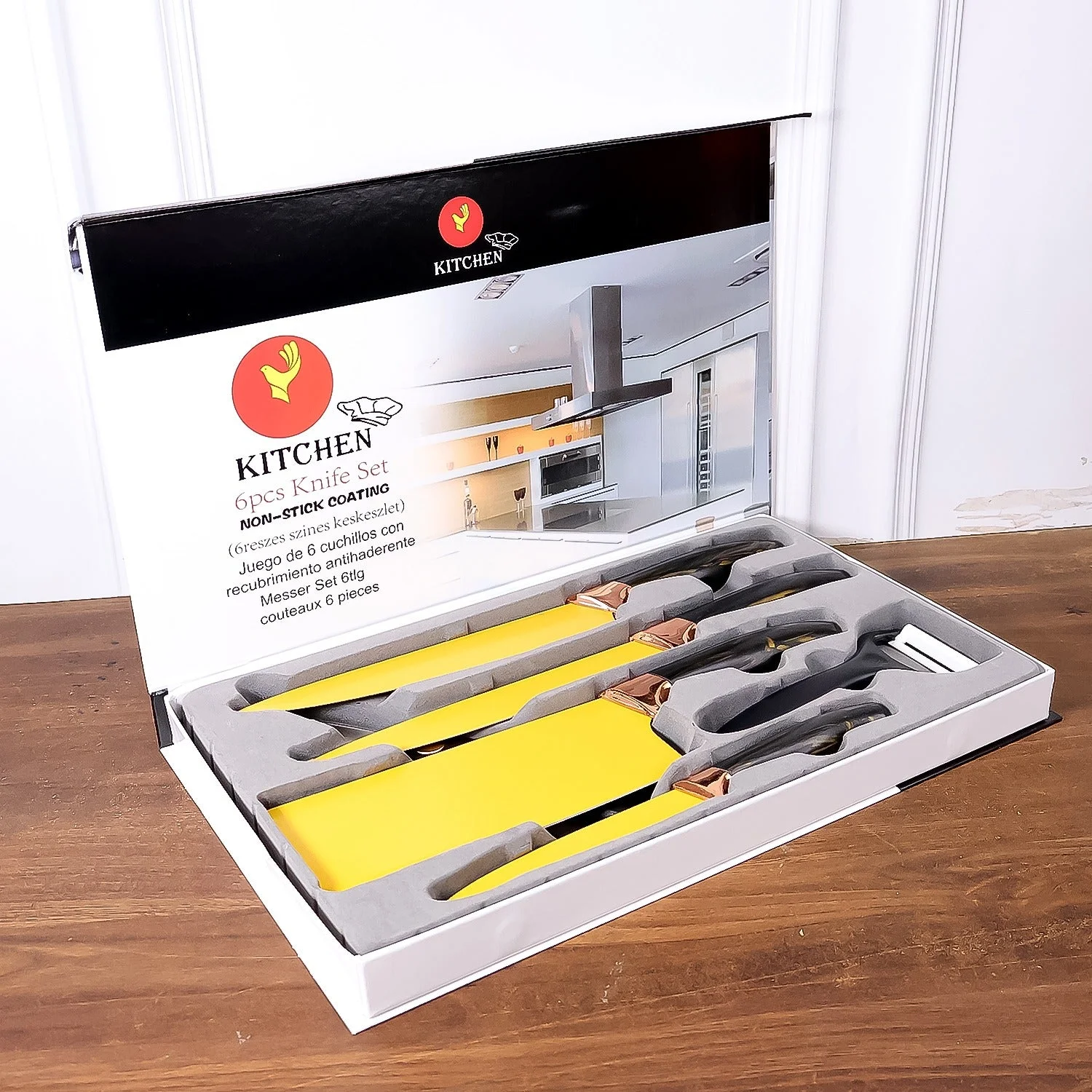Upgrade your kitchen essentials with this 6 Pcs Professional Knife Set, designed to handle every slicing, dicing, chopping, and peeling task with ease. Each knife features a high-quality stainless steel blade with a striking yellow non-stick coating for both style and function. The ergonomically designed handles ensure a firm, comfortable grip for smooth handling and precision.