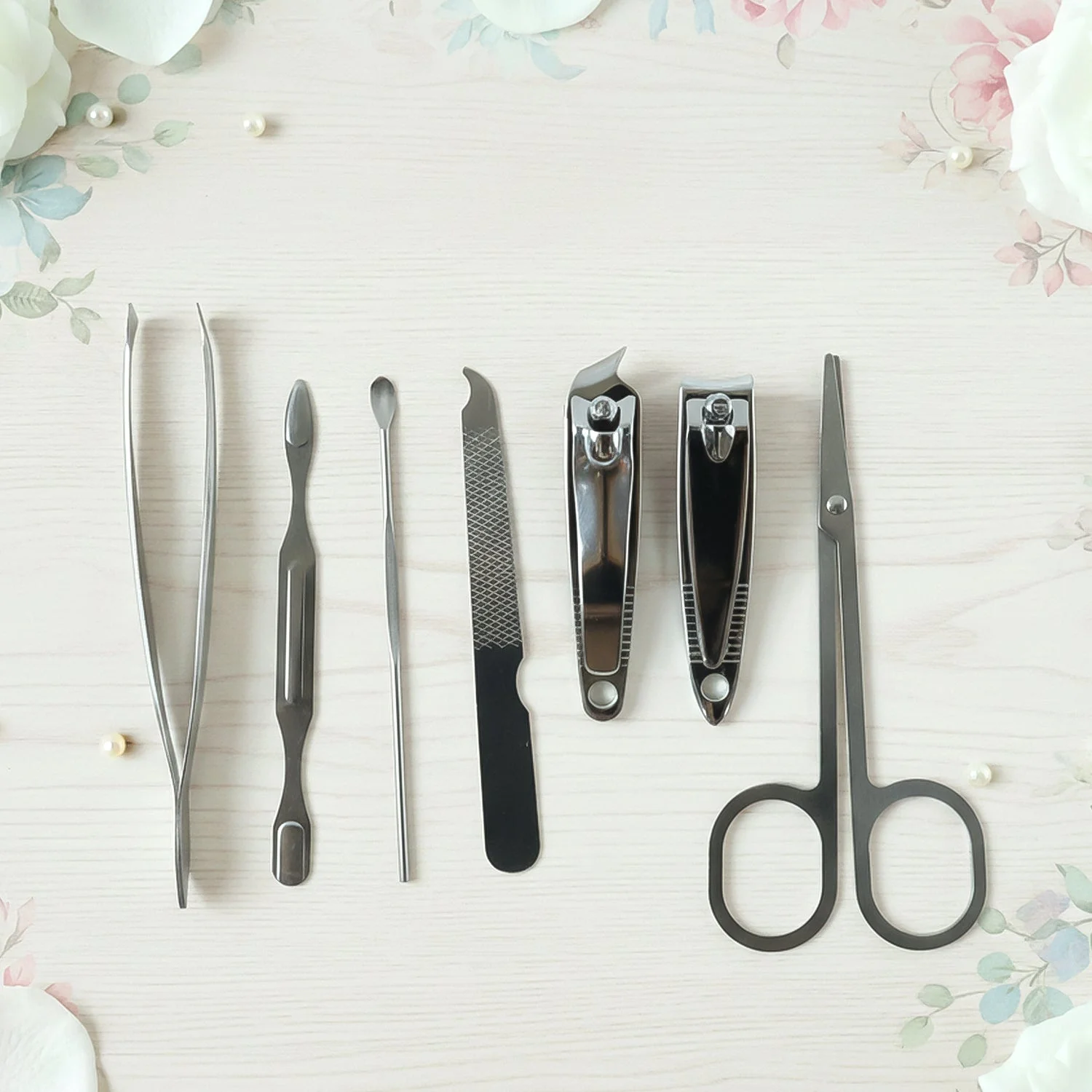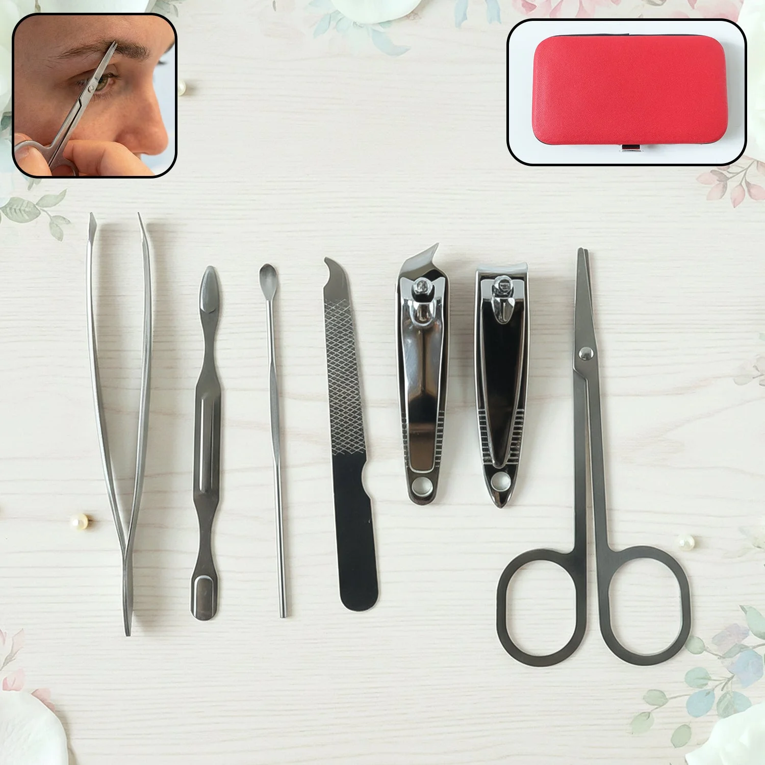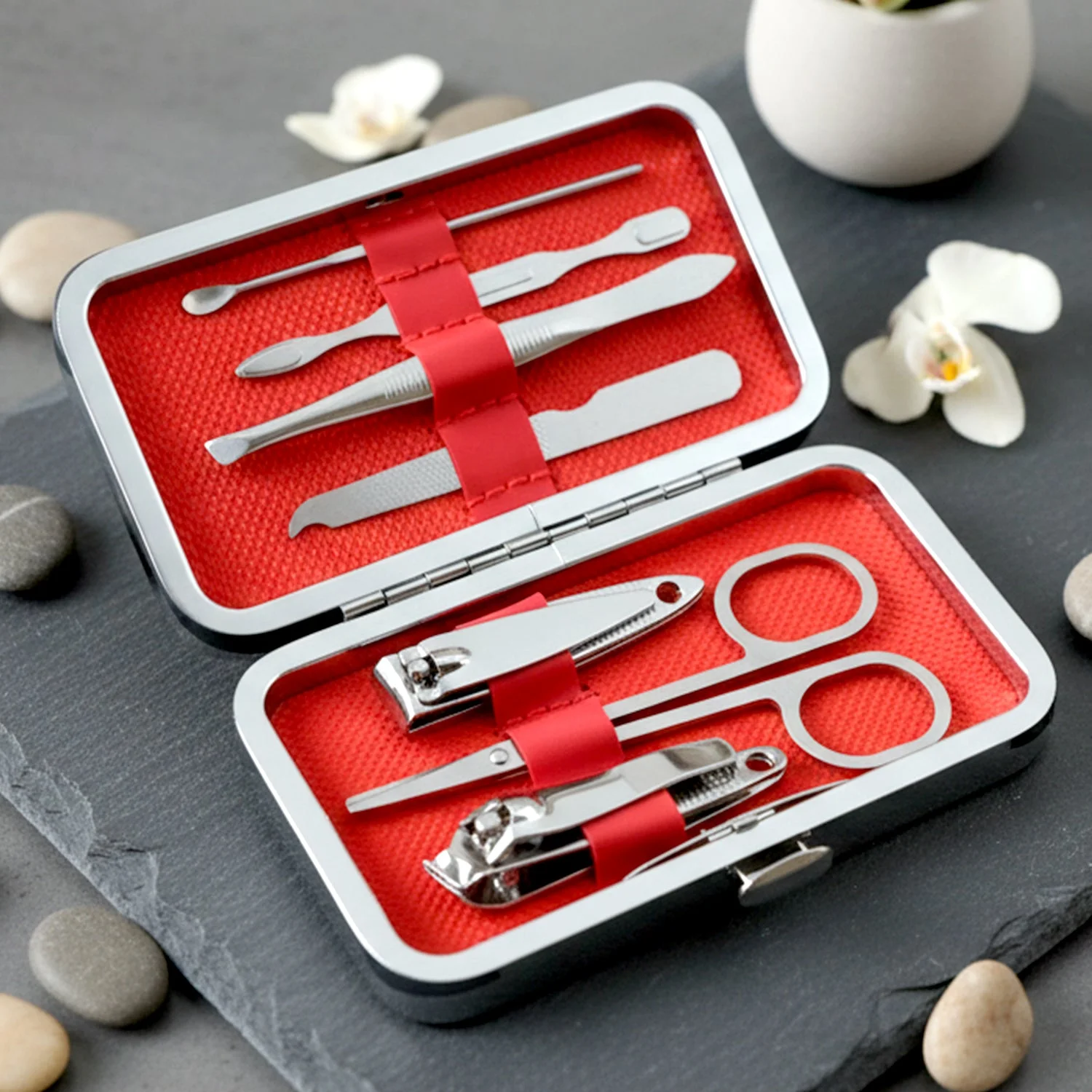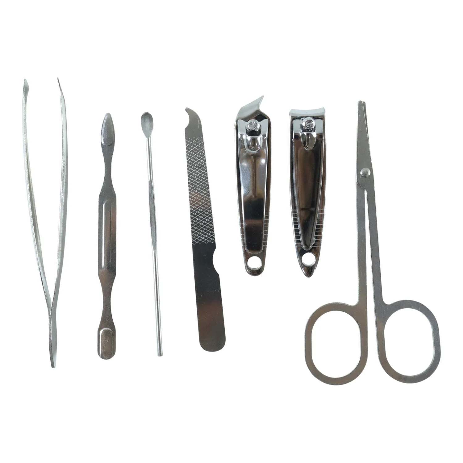 7 in 1 stainless steel manicure pedicure grooming kit, stainless steel nail cutter set, manicure pedicure tool kit with scissors, tweezer nail file ear pick set, compact personal care grooming tools, travel manicure set with storage case, portable grooming kit for men and women, all in one nail care kit, professional stainless steel beauty tools, home and travel grooming set
