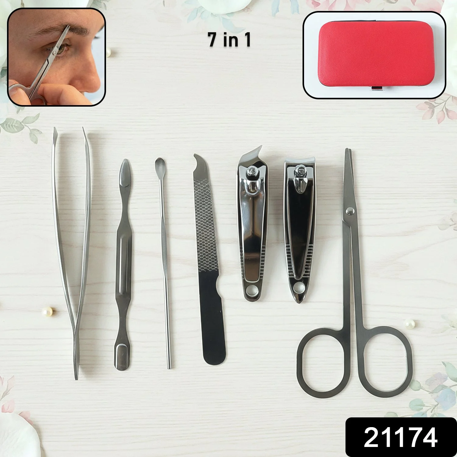 This 7 in 1 grooming kit is a complete personal care solution designed for everyday nail, eyebrow, and hygiene maintenance. The set includes essential tools for trimming, shaping, cleaning, and grooming, neatly organized in a compact protective case. Each tool is designed for precise handling and comfortable use, making routine grooming simple and efficient. Suitable for regular home use as well as travel, this kit helps maintain a clean and well-groomed appearance with ease.