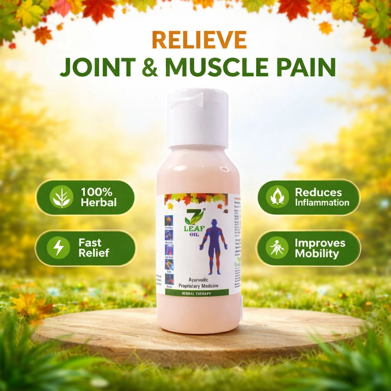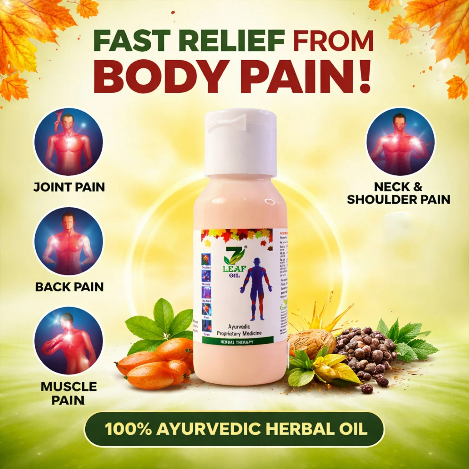 7 Leaf Ayurvedic Herbal Oil is a traditional herbal therapy oil formulated to help relieve joint pain, muscle stiffness, and body aches. Made using a blend of natural Ayurvedic ingredients, this herbal oil helps soothe sore muscles, reduce inflammation, and support better mobility. The natural formula works gently on the body to provide comfort from everyday pain caused by fatigue, physical activity, or long working hours.