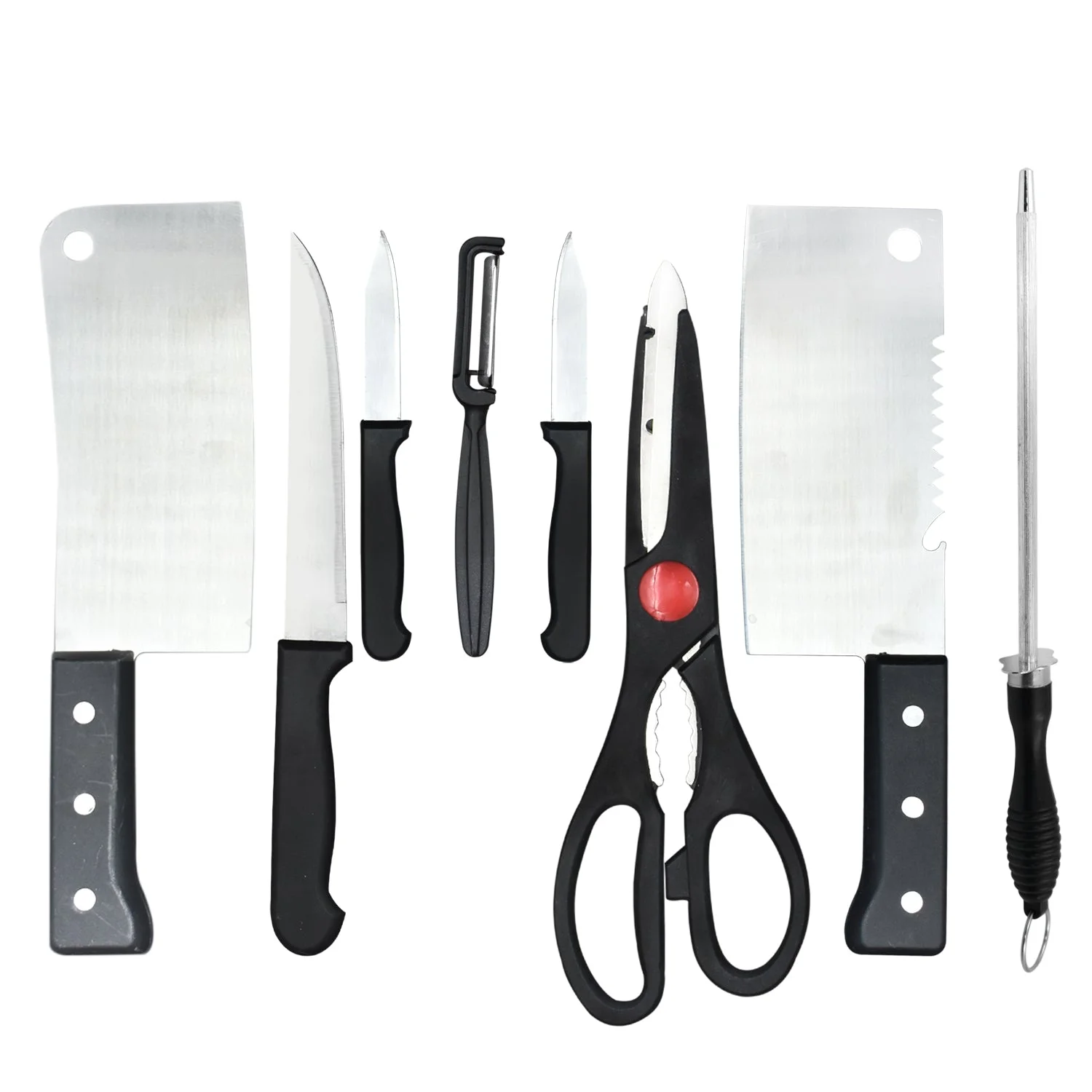 kitchen knife board set is a set of Eight pieces that includes five knives, a pair of scissors, and 2 Butcher Knife. These knives are made of the finest quality stainless steel, which is why they do not need sharpening at any point of time, and are immune to vegetable acids that might have otherwise damaged them. These knives have attractive handles that not only look good but are easy to grip while cutting. The surface finish of these knives also prevents them from getting corroded over time. Kitchen knife set has been tempered, allowing them to cut things easily with the least amount of effort. These knives have been provided in various sizes, each of which can be used to cut specific food items. They also have high definition serrations, which makes cutting easier. that comes with this set is also an ideal addition to your collection. It helps make the chopping faster and better, without a mess, as it is big enough to accommodate large items. These knives have black plastic handles and stainless-steel blades.The scissors that has been included here is helpful in cleaning and clipping certain food items. It can be hung when not in use.