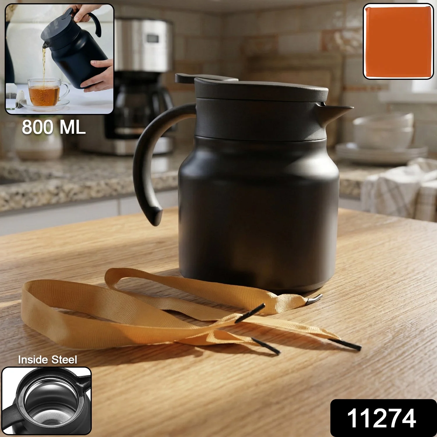 Enjoy your favorite beverages at the perfect temperature with this premium 800 ML insulated thermos flask. Designed for both hot and cold drinks, this flask features a sturdy handle and an adjustable strap for easy carrying during travel, office use, or outdoor activities. The inner steel construction ensures better temperature retention while maintaining the freshness of your drinks. Its sleek and modern design makes it ideal for everyday use at home or on the go. Perfect for serving tea, coffee, or any beverage with convenience and style.