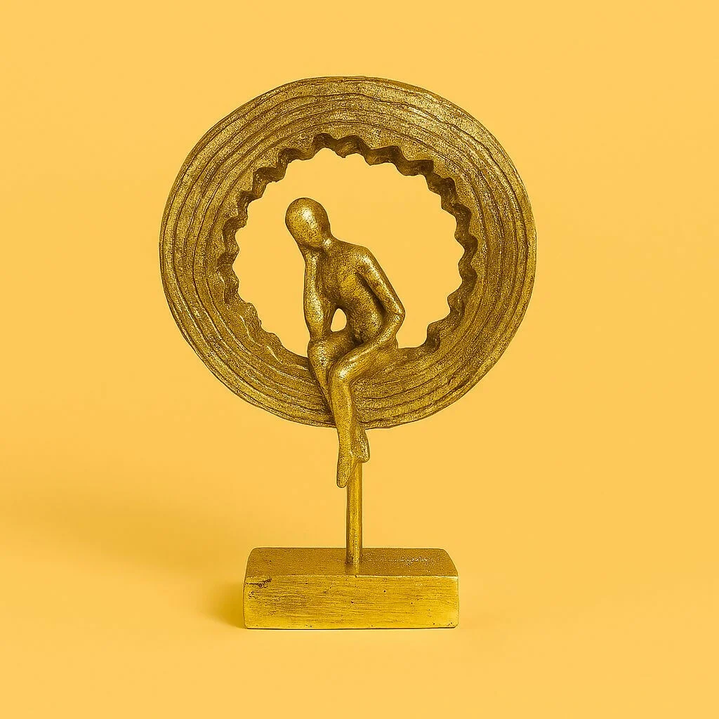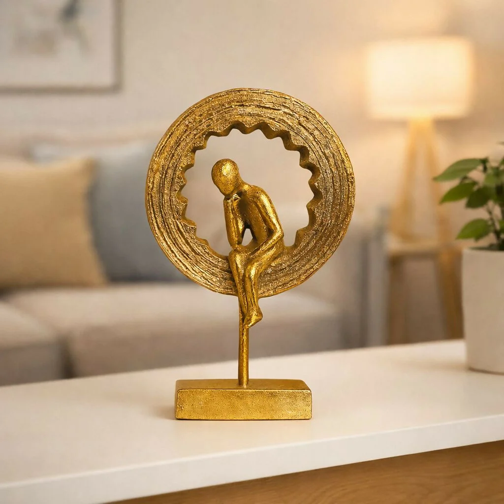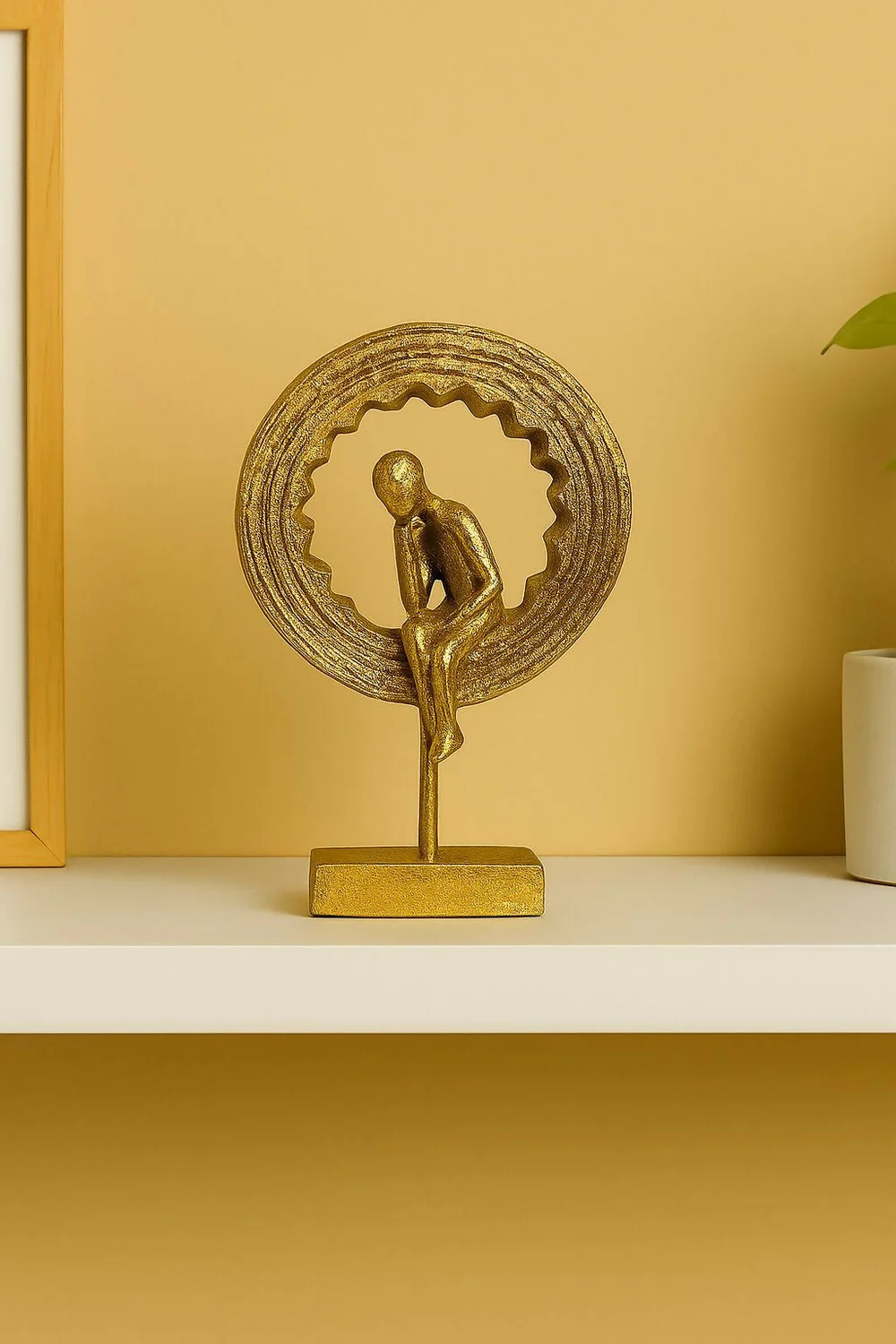 Add a touch of artistic elegance to your space with this abstract thinking man sculpture showpiece. Crafted with a modern circular design and finished in a luxurious golden tone, this decorative figurine symbolizes creativity, mindfulness, and contemplation. The minimalist art style makes it a perfect addition to living rooms, offices, study tables, bookshelves, and modern interior décor setups. Its sturdy base ensures stable placement while enhancing the aesthetic appeal of any space.