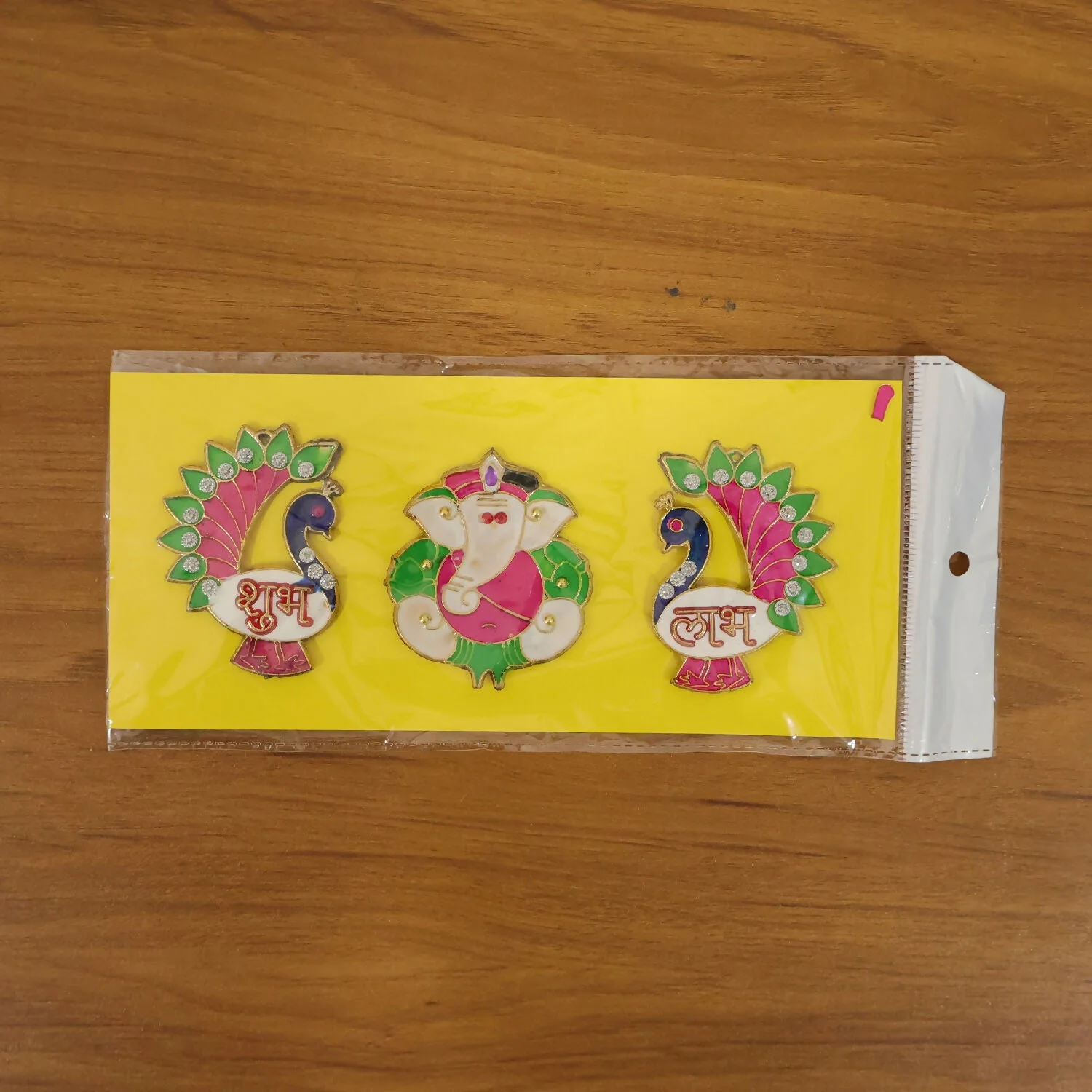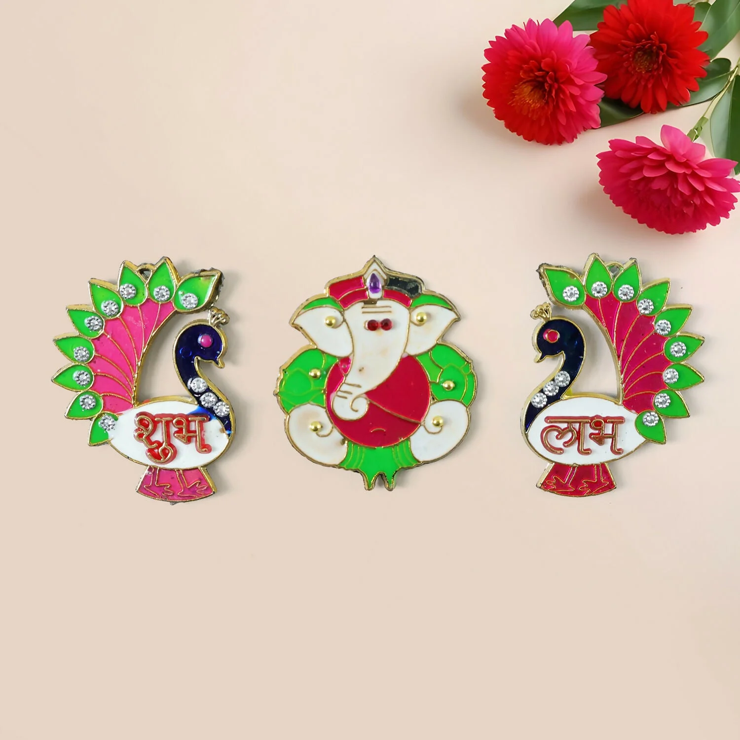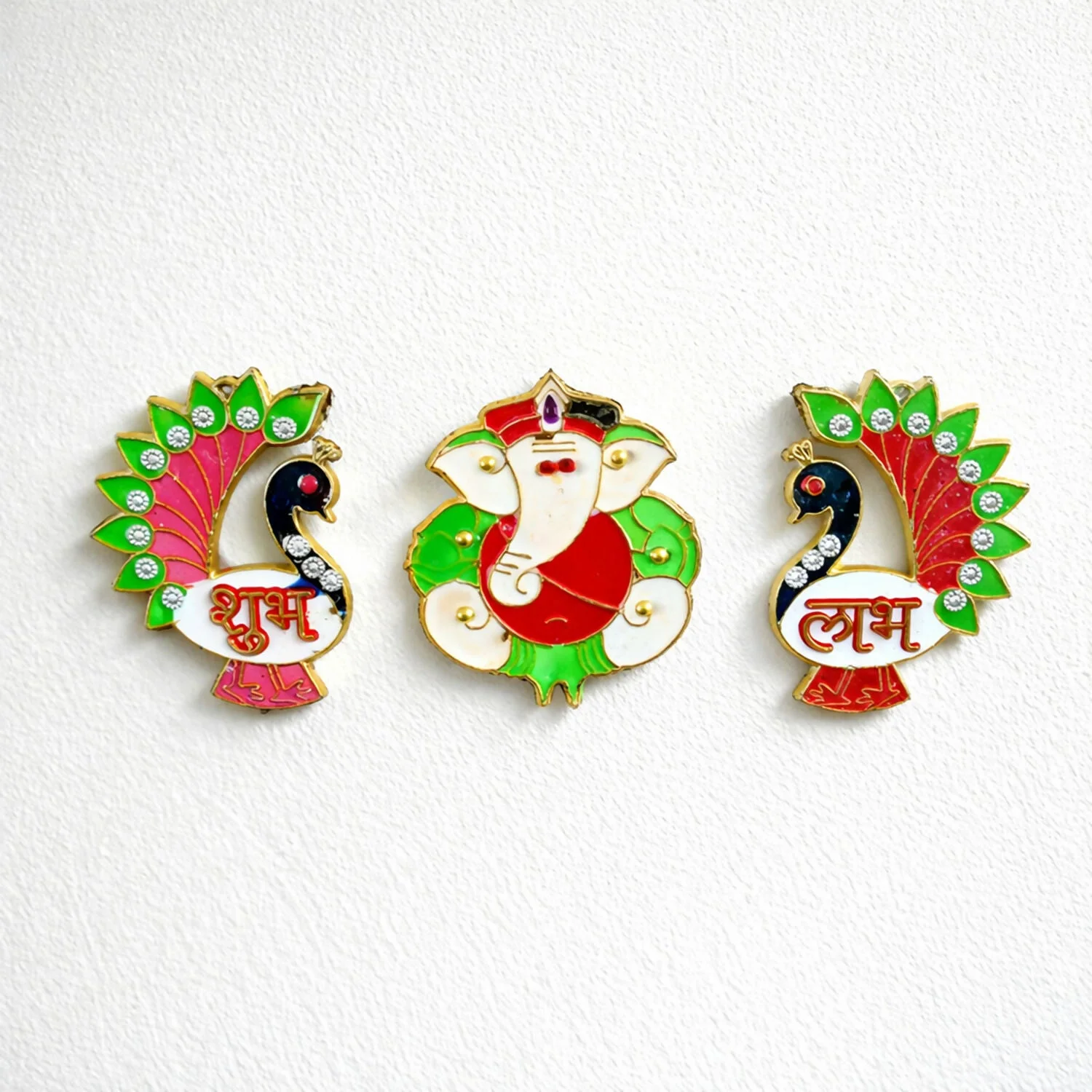 Be the first to review Acrylic Meenakari Peacock Ganesh Shubh Labh Door Hanging – Set of 3!