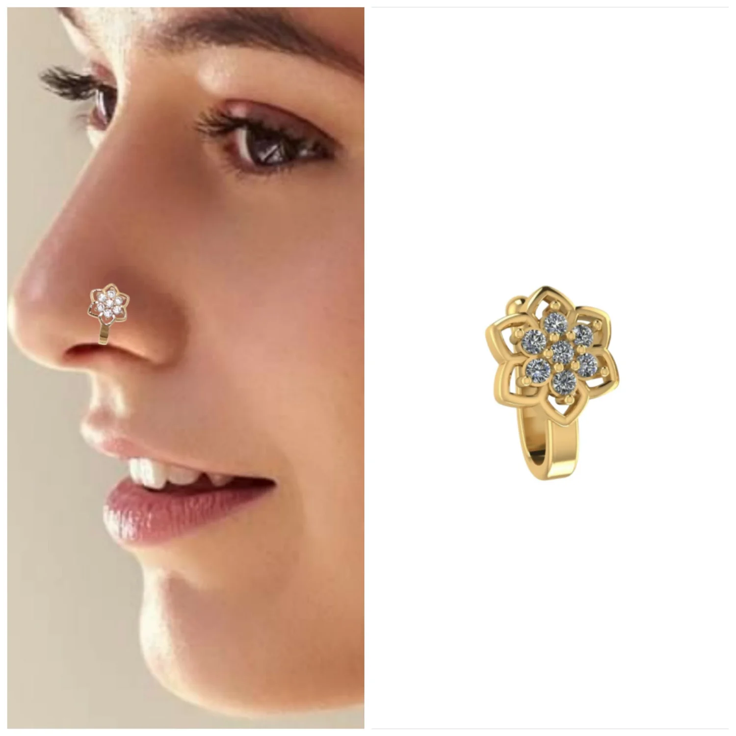 Instantly achieve the glamorous look of a nose piercing without the commitment! This fashionable Combo Set includes two versatile and sparkling non-pierced nose clips (or nose cuffs), giving you the flexibility to match different outfits and styles.