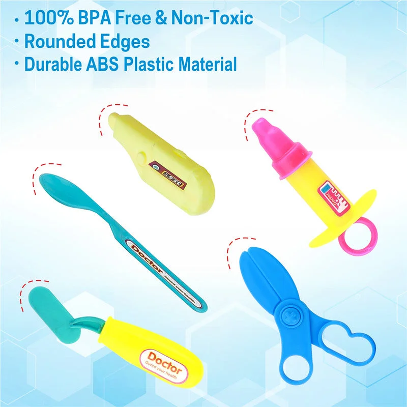 This doctor play kit from Aditi includes multiple medical tools such as a stethoscope, injection, thermometer, glasses and more. All items are made from non-toxic, BPA-free ABS plastic with smooth, rounded edges for safe play. The carry case keeps the tools organized and easy to store. Helps children learn role-play, imagination and basic medical awareness. Ideal for everyday indoor play and gifting.