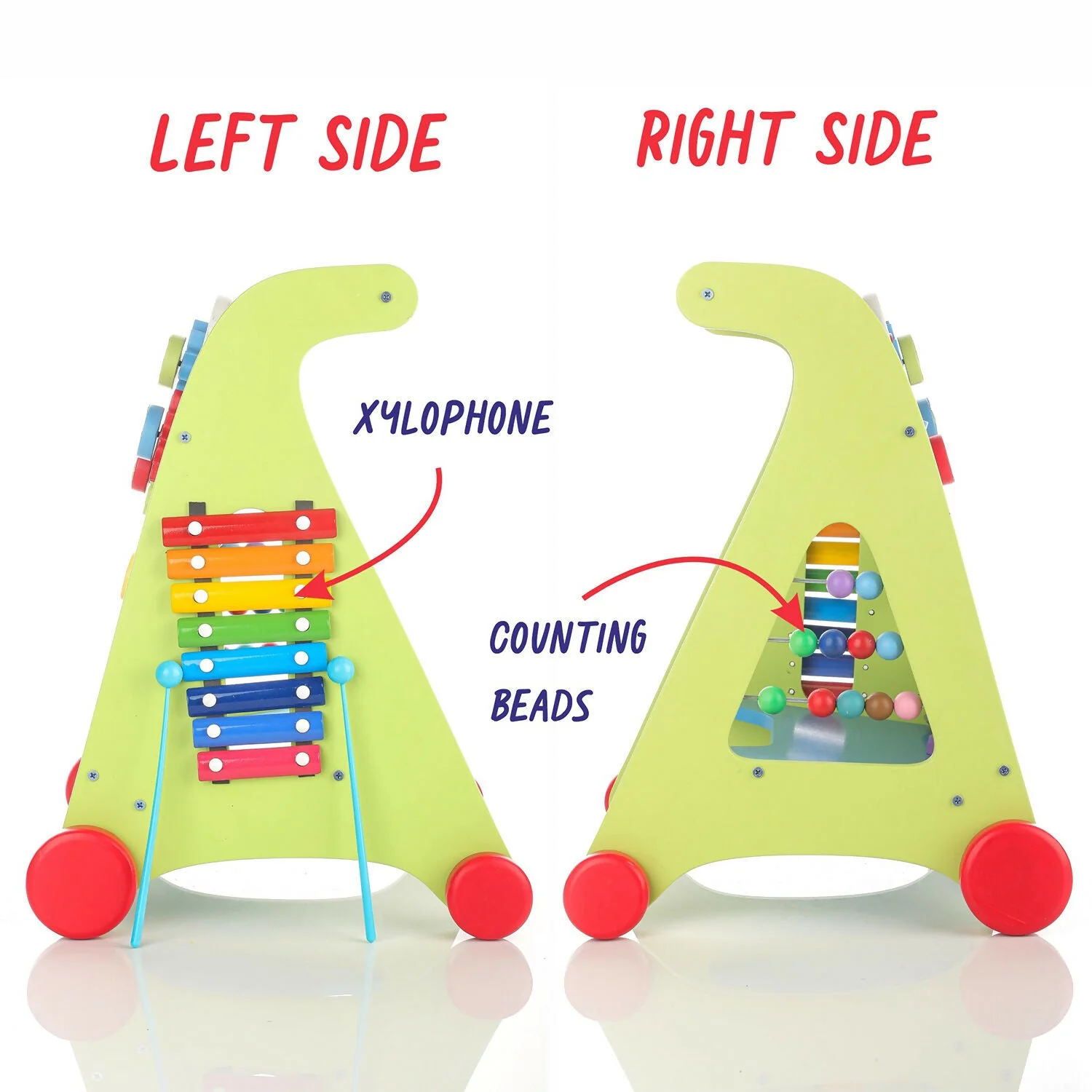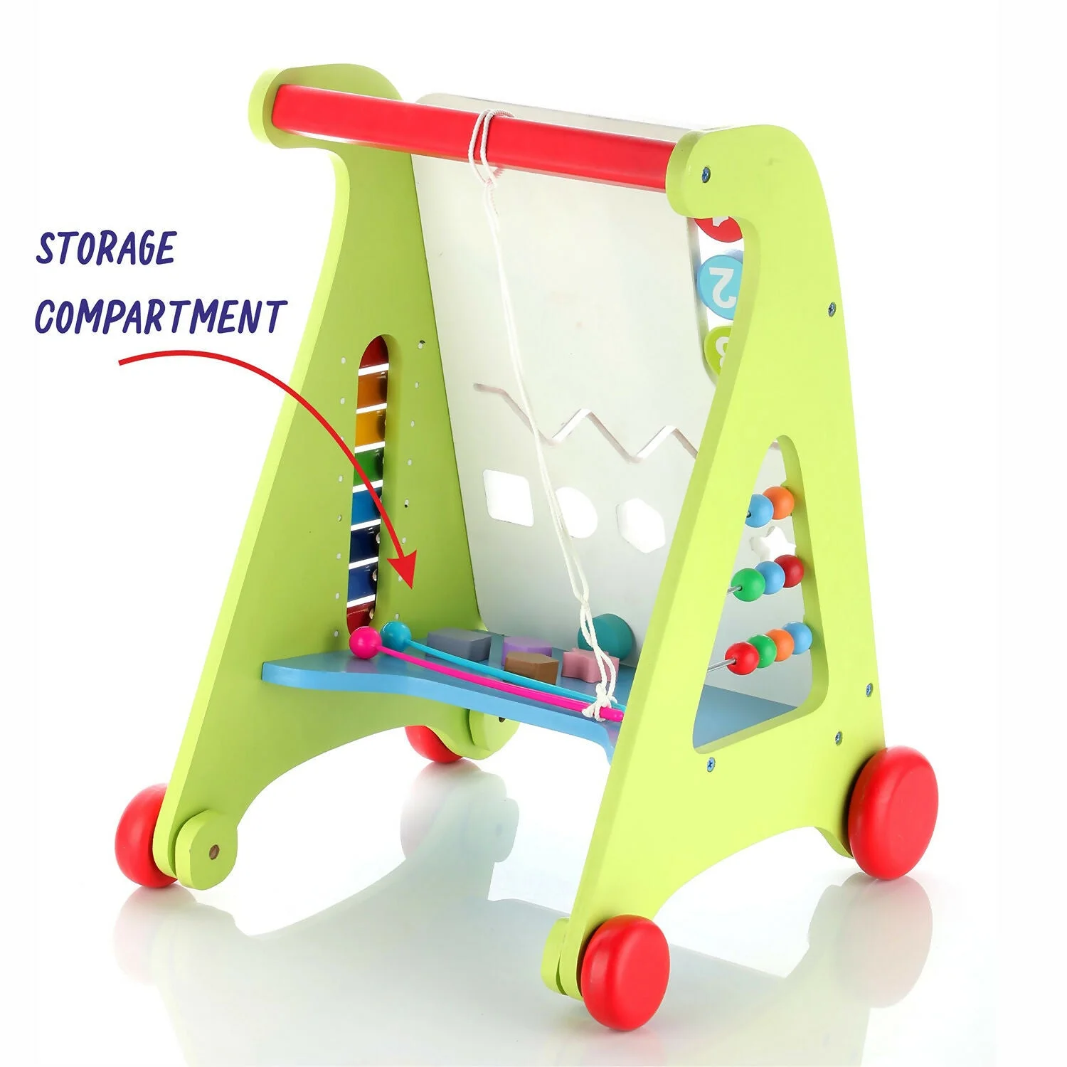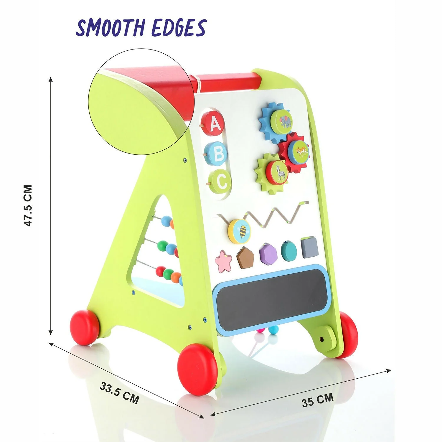 This colorful wooden baby walker is designed to support your little one’s first steps while making learning fun and engaging. It features an interactive activity board with alphabet sliders, rotating gears, bead rollers, shape blocks, and a small drawing area to keep toddlers entertained for hours. The sturdy frame and easy-grip handle provide balance and confidence as babies practice walking. Smooth wheels ensure gentle movement across indoor floors without damaging surfaces. Perfect for early development, this walker helps improve motor skills, hand-eye coordination, balance, and cognitive learning in growing toddlers.