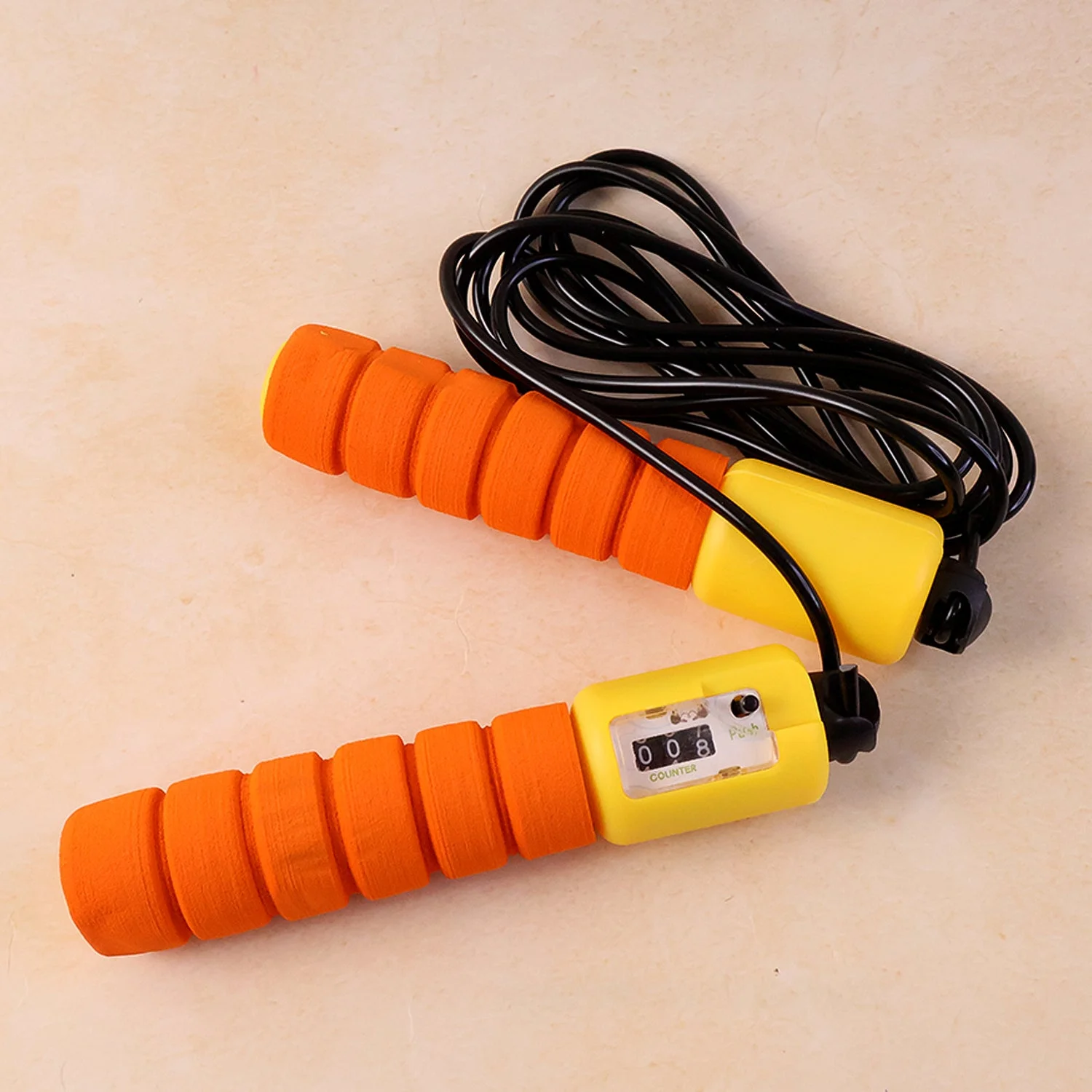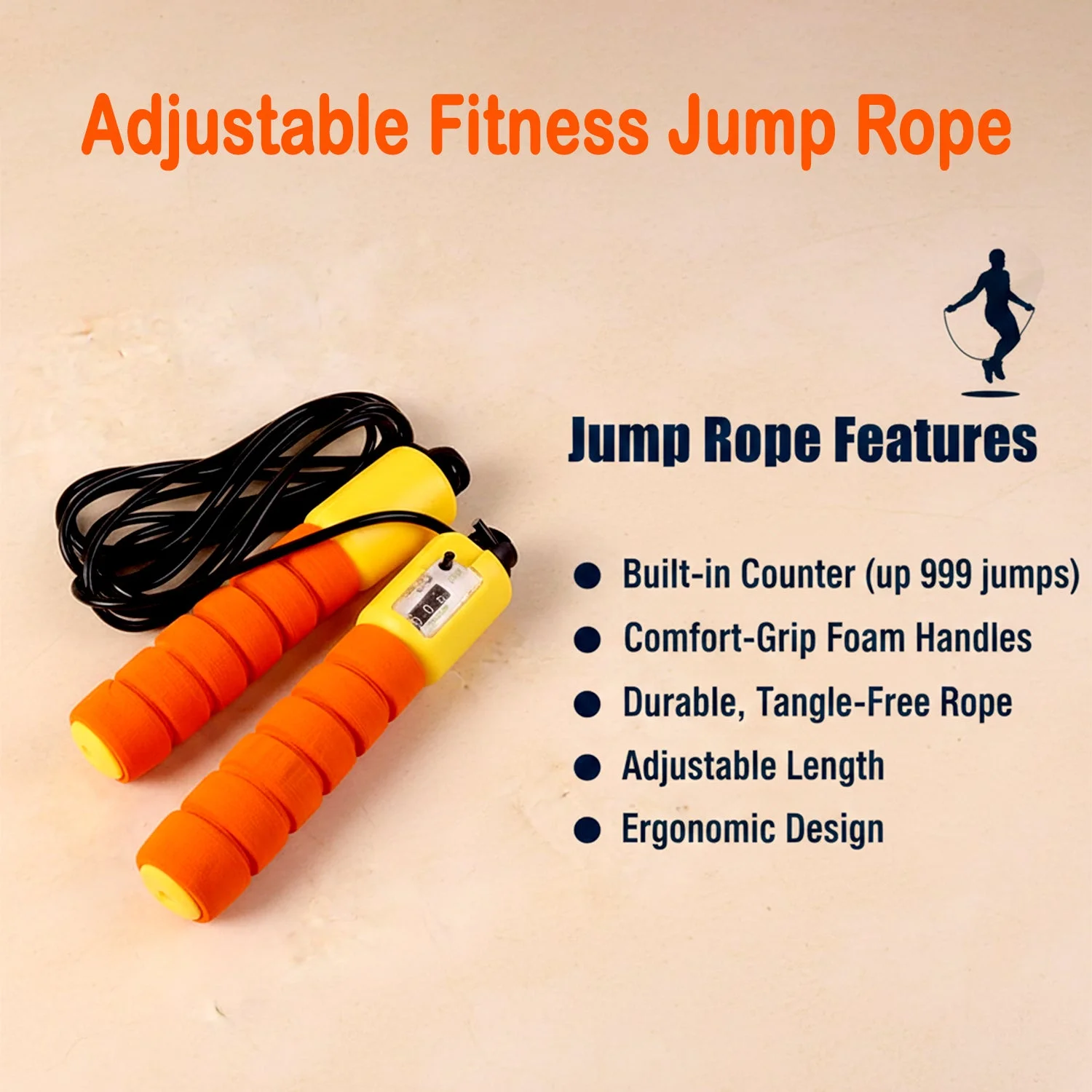 This adjustable fitness jump rope is designed to support effective cardio workouts, endurance training, and daily exercise routines. Equipped with a built-in digital jump counter, it helps track workout performance and maintain consistency during training sessions. The rope features comfortable anti-slip foam handles that provide a firm grip even during extended workouts. Lightweight and easy to carry, it is suitable for indoor and outdoor use, making it ideal for home workouts, gym sessions, or travel fitness routines. Whether used for warm-ups, high-intensity training, or general fitness, this jump rope offers a simple and efficient way to stay active.