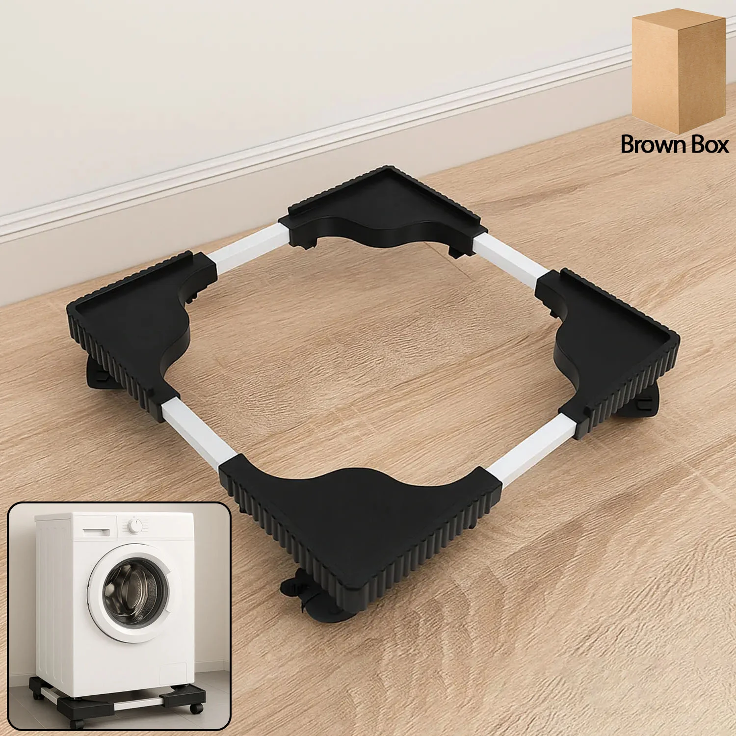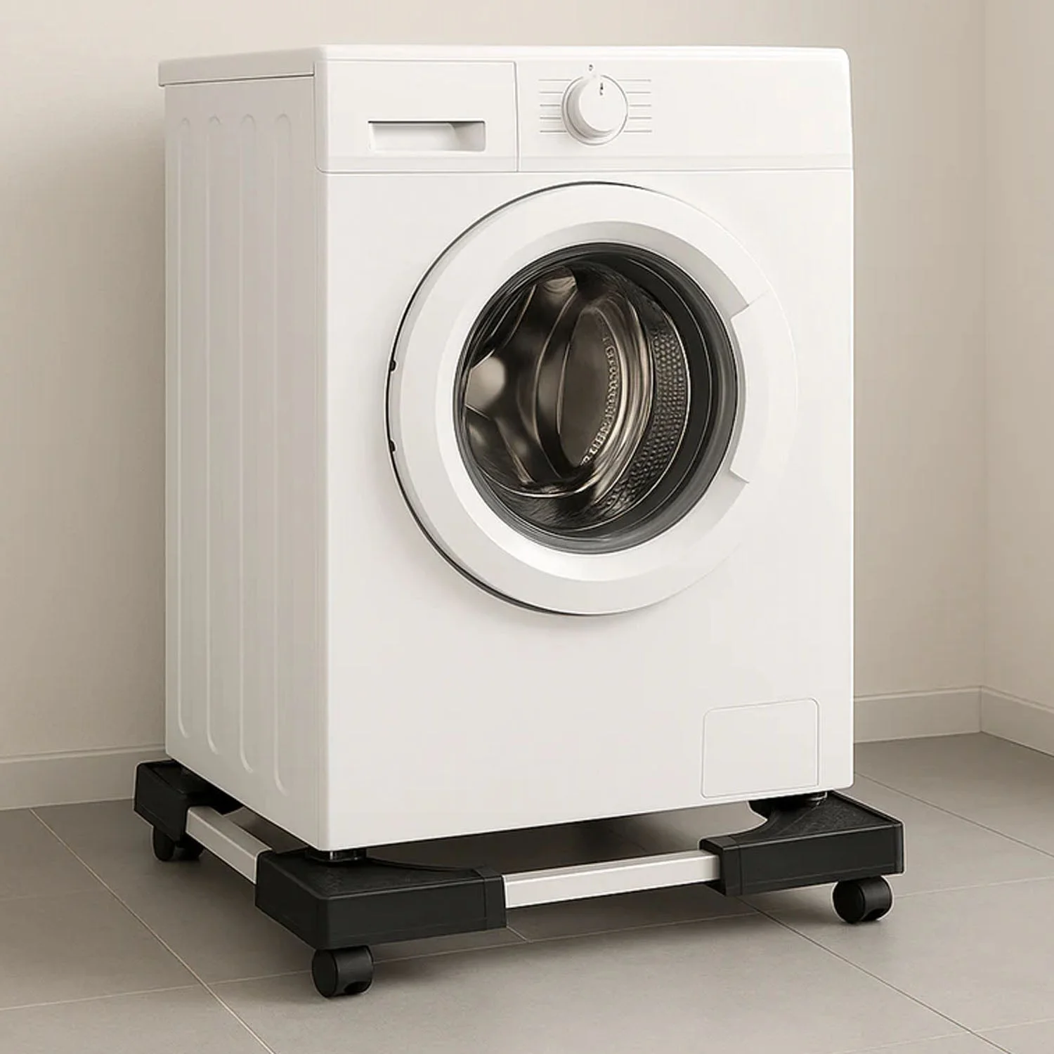 adjustable washing machine stand, refrigerator stand with anti-vibration base, heavy-duty appliance stand, movable appliance stand, home appliance support, washing machine riser, fridge support stand, vibration-reducing appliance stand, adjustable home appliance platform, kitchen appliance stand, laundry room appliance base, durable appliance riser, rolling appliance stand
