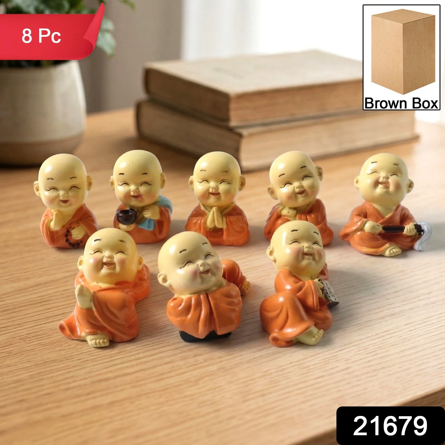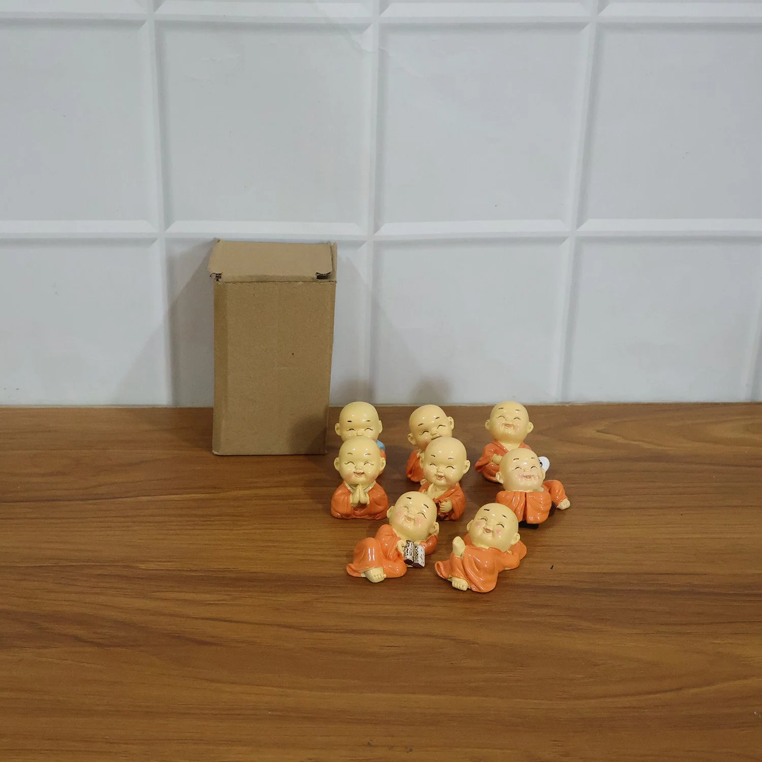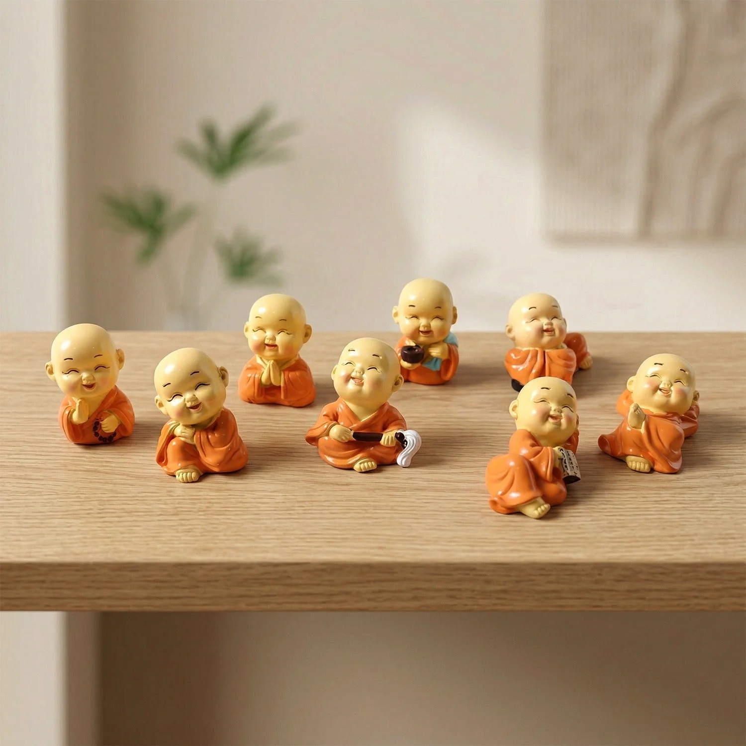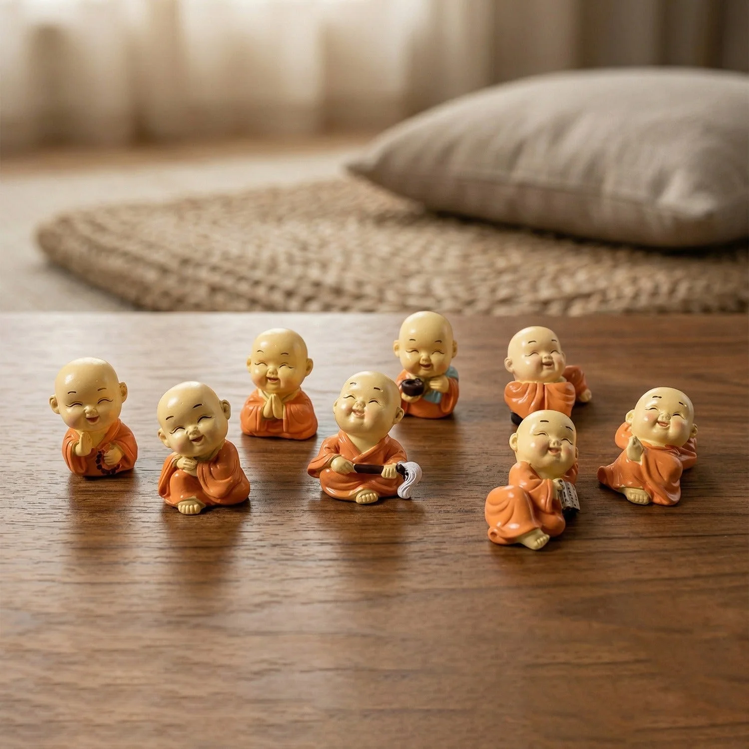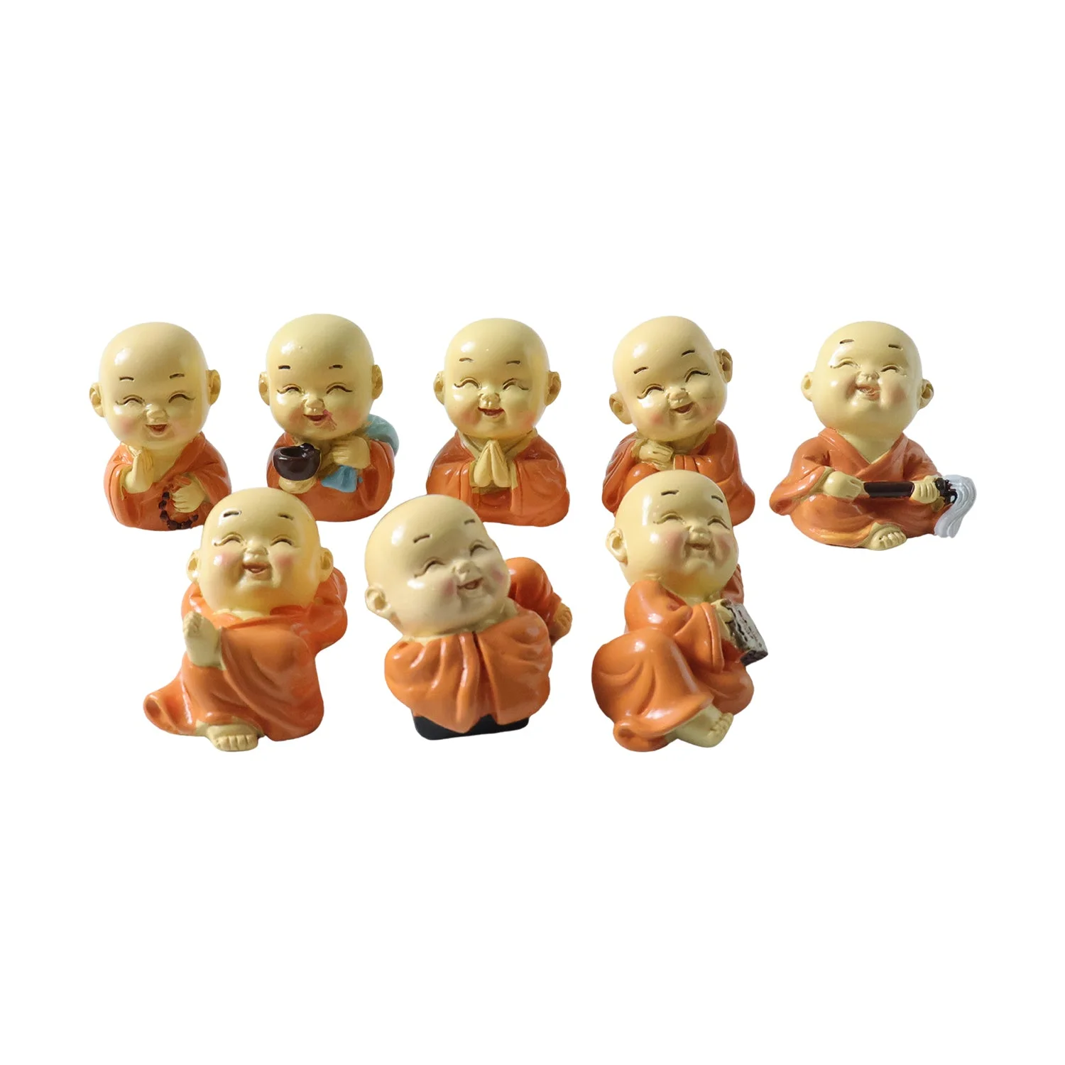 Adorable Mini Monk Buddha Idol Set 8 Pc – Decorative Laughing Monk Figurines for Car Dashboard, Home Decor, Office Table & Spiritual Gift Collection